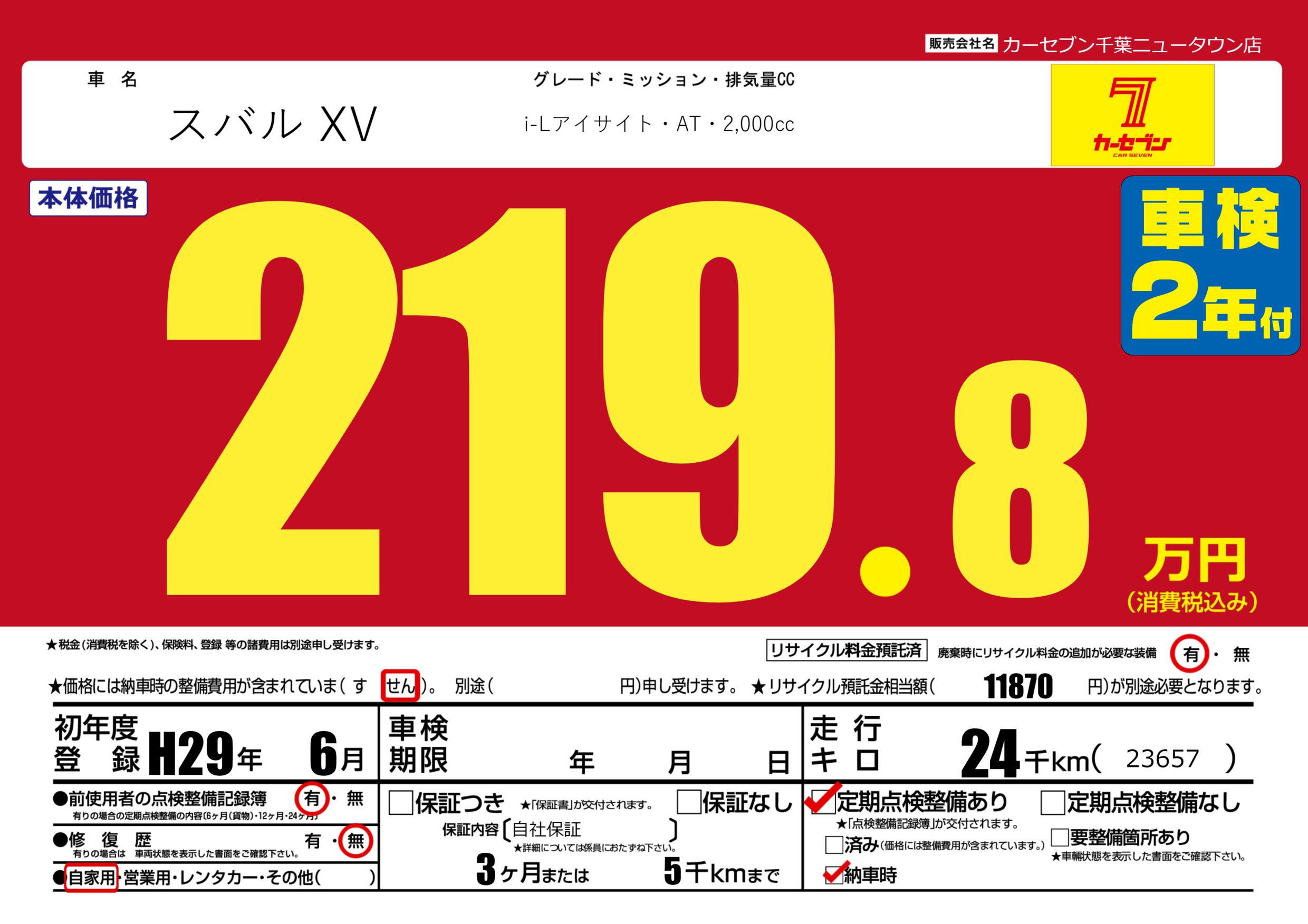 | 車名 | スバル XV | グレード ミッション 排気量 |