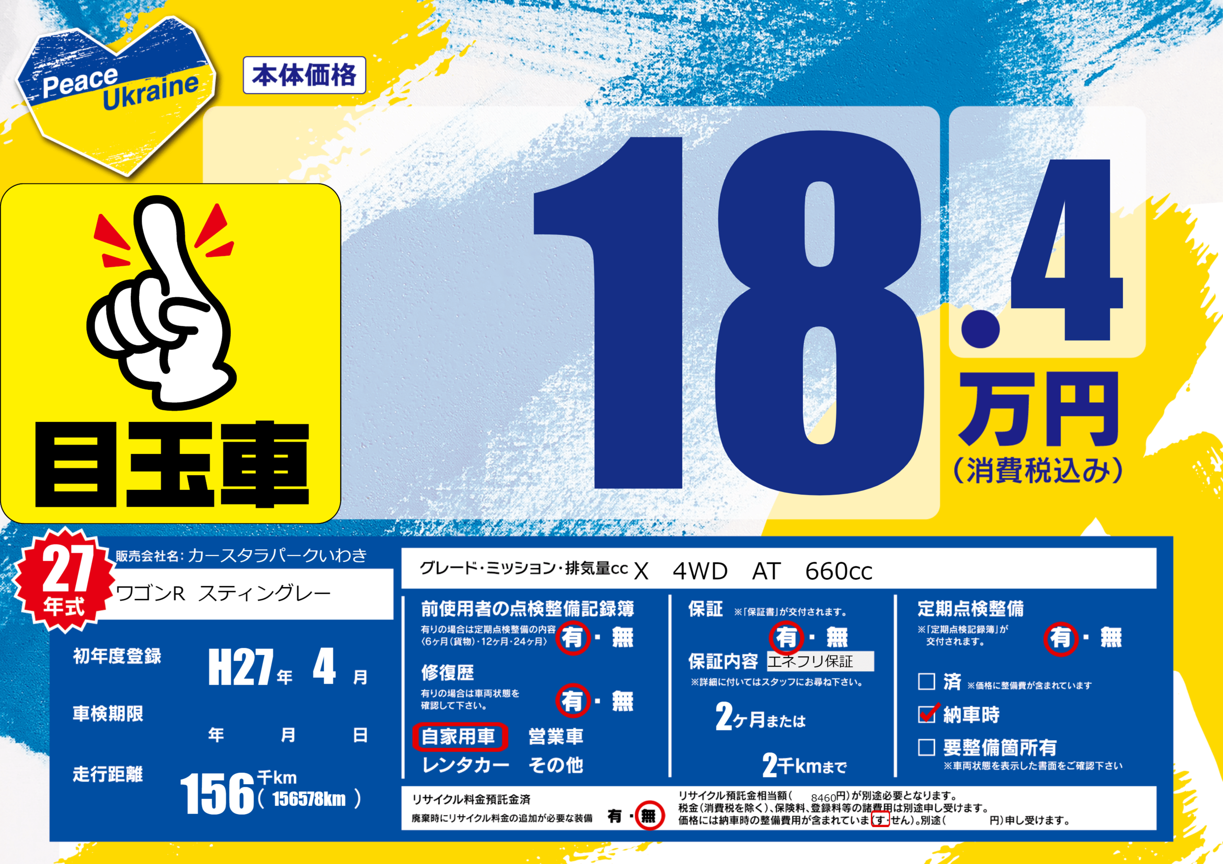 | 走行キロ | 15.6万km | 初年度登録 | H27年4月 |