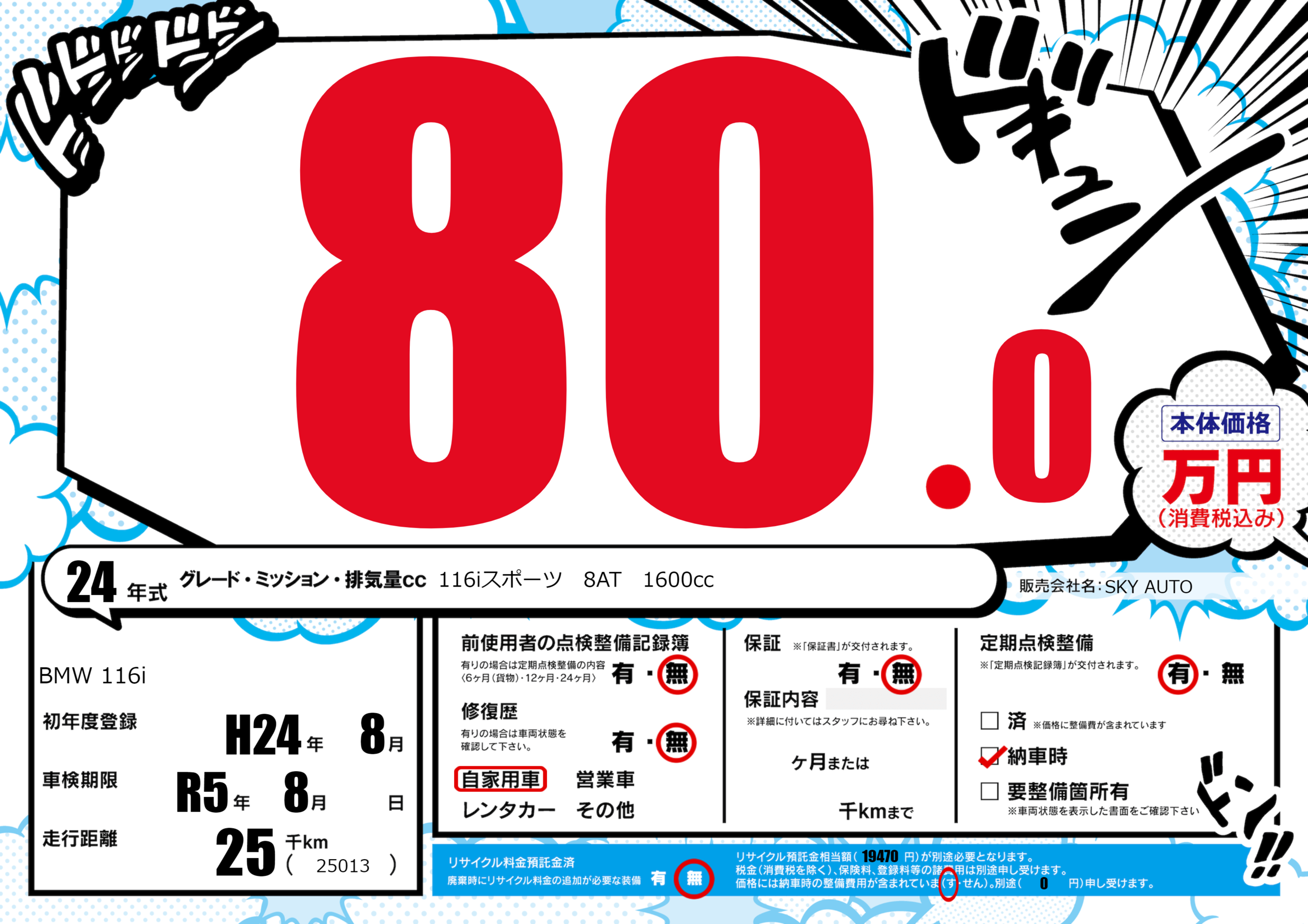 | 車名 | BMW 116i | グレード ミッション 排気量 |