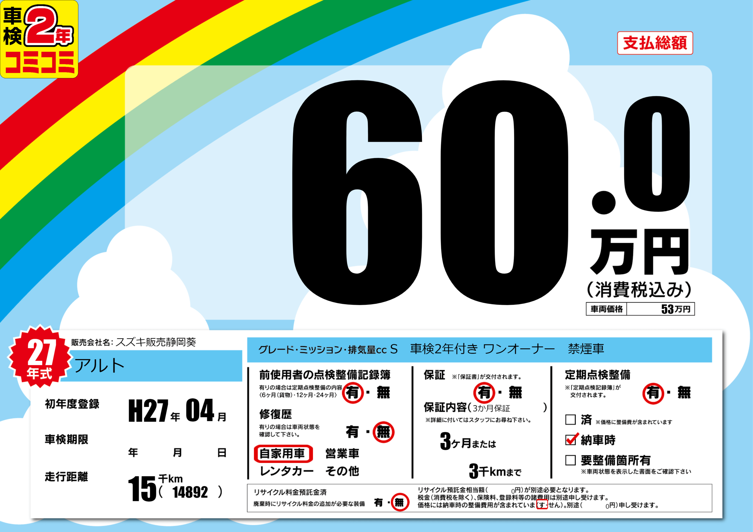 | 定期点検整備 | 定期点検整備あり 納車時あり | ||