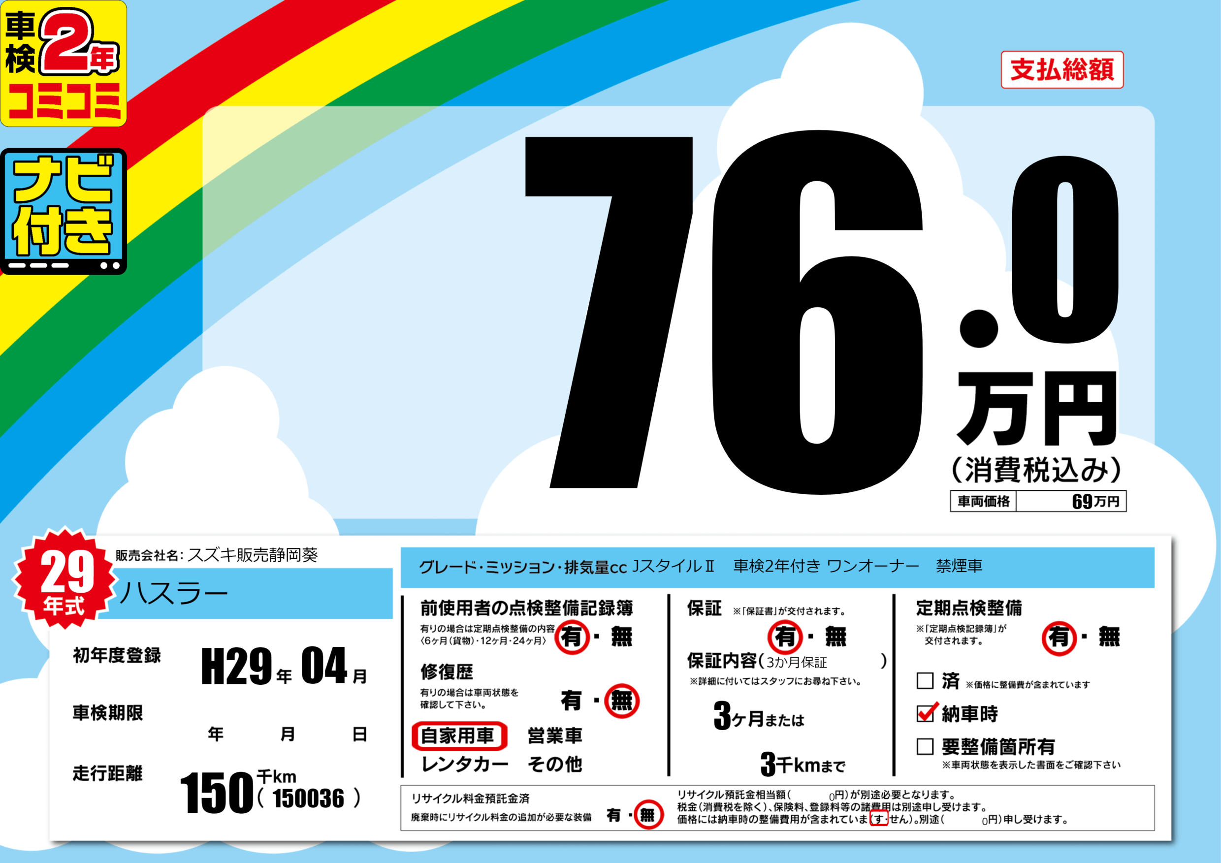 | 定期点検整備 | 定期点検整備あり 納車時あり | ||