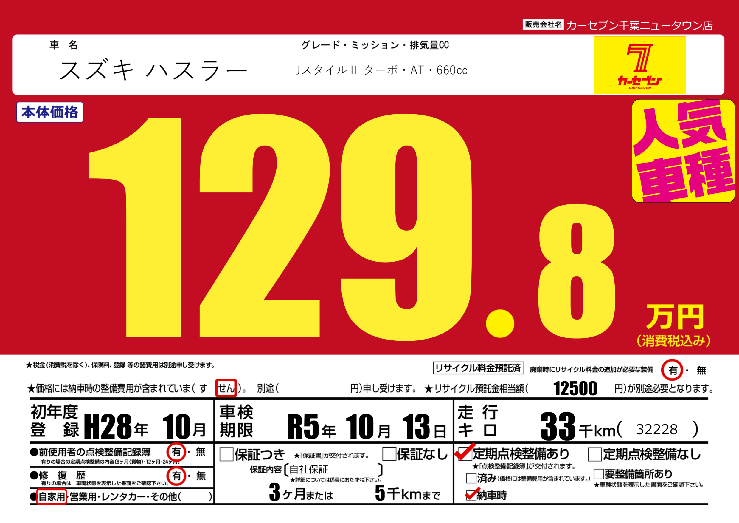 | 車名 | スズキ ハスラー | グレード ミッション 排気量 |