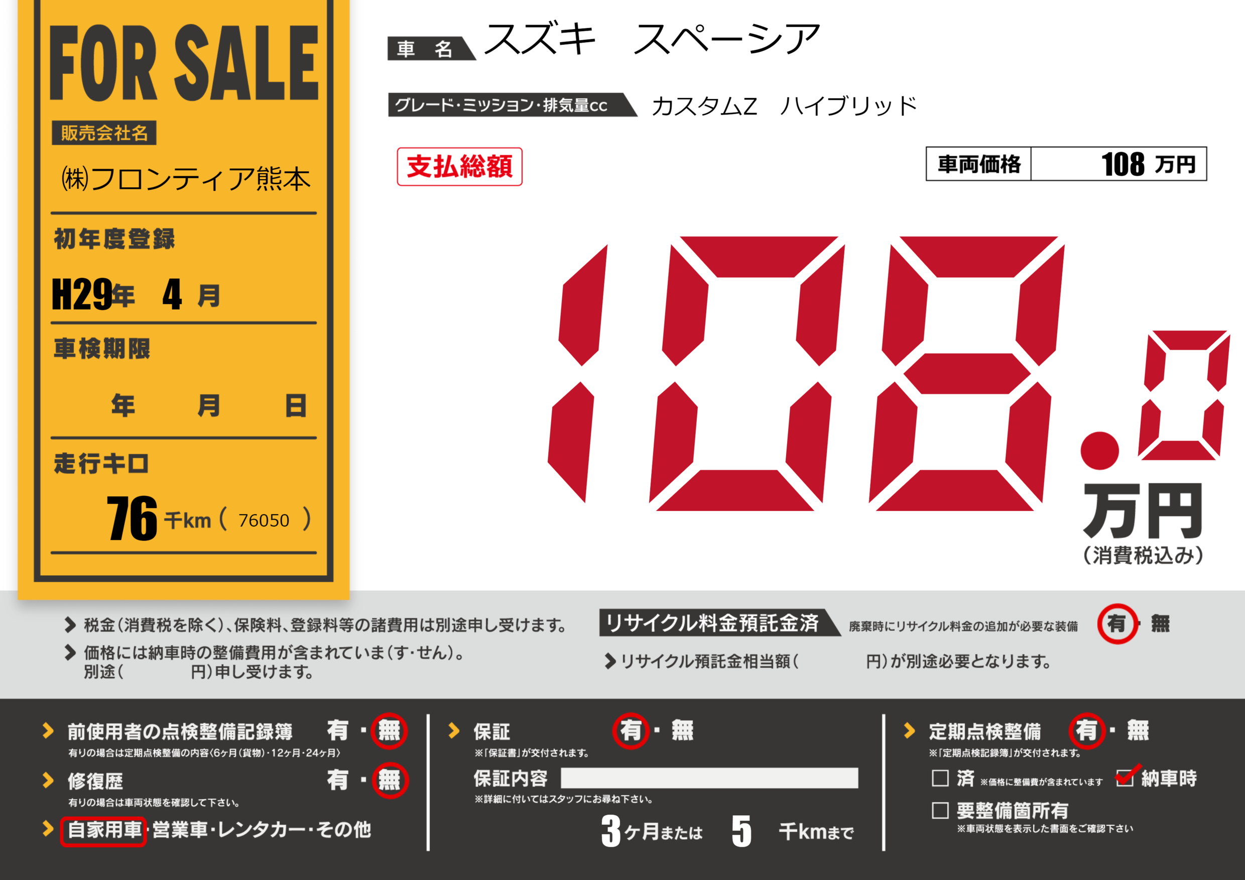 | 定期点検整備 | 定期点検整備あり 納車時あり | ||
