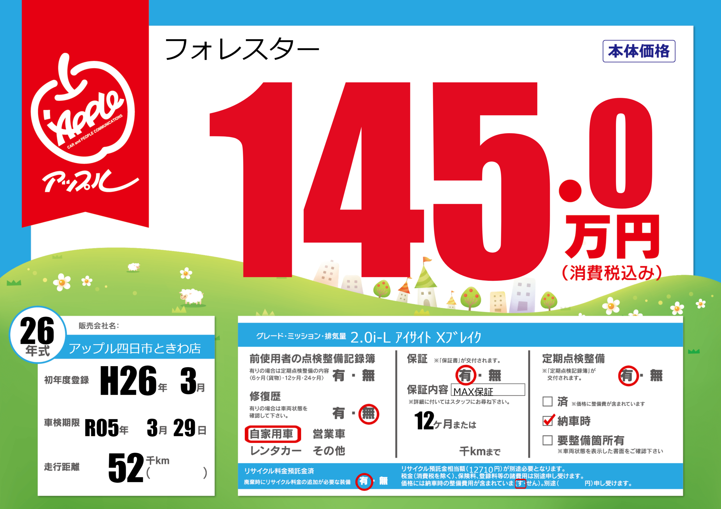 | 車名 | フォレスター | グレード ミッション 排気量 |