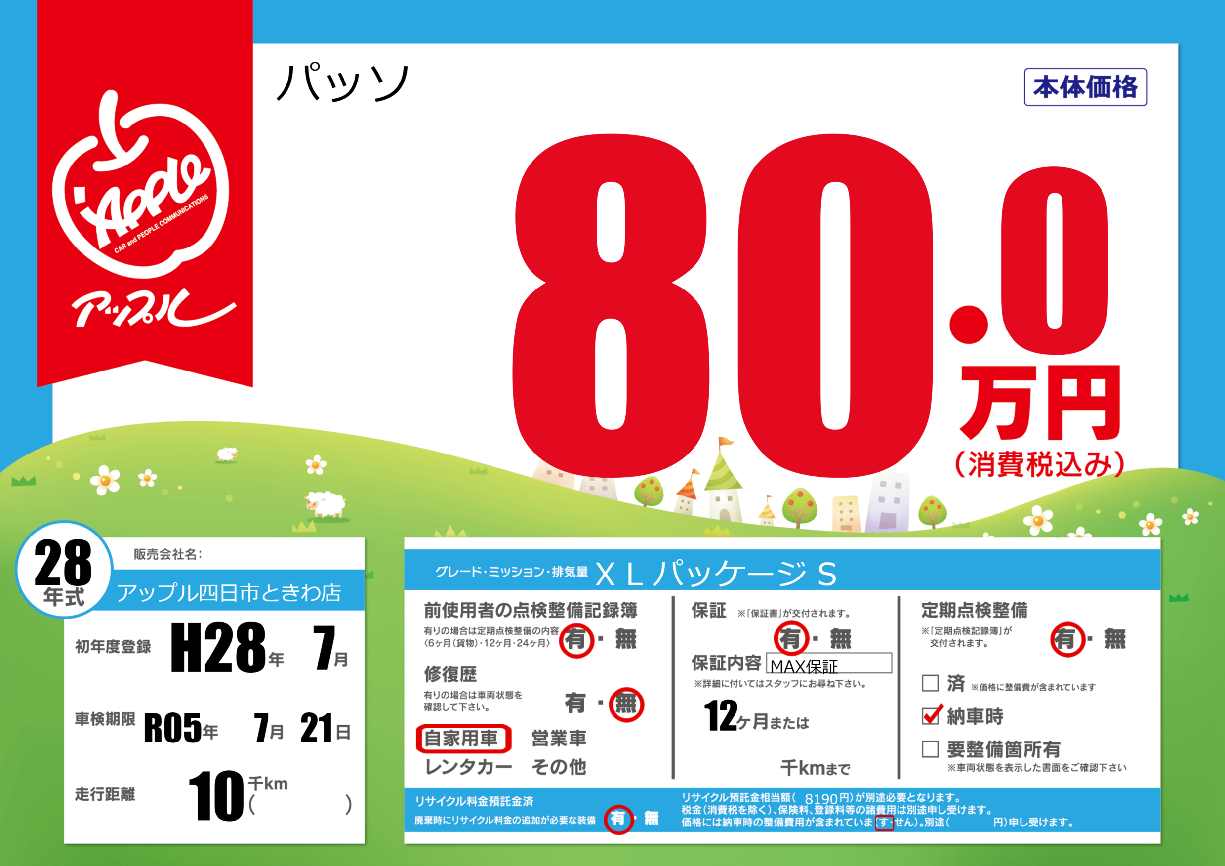 | 車名 | パッソ | グレード ミッション 排気量 |