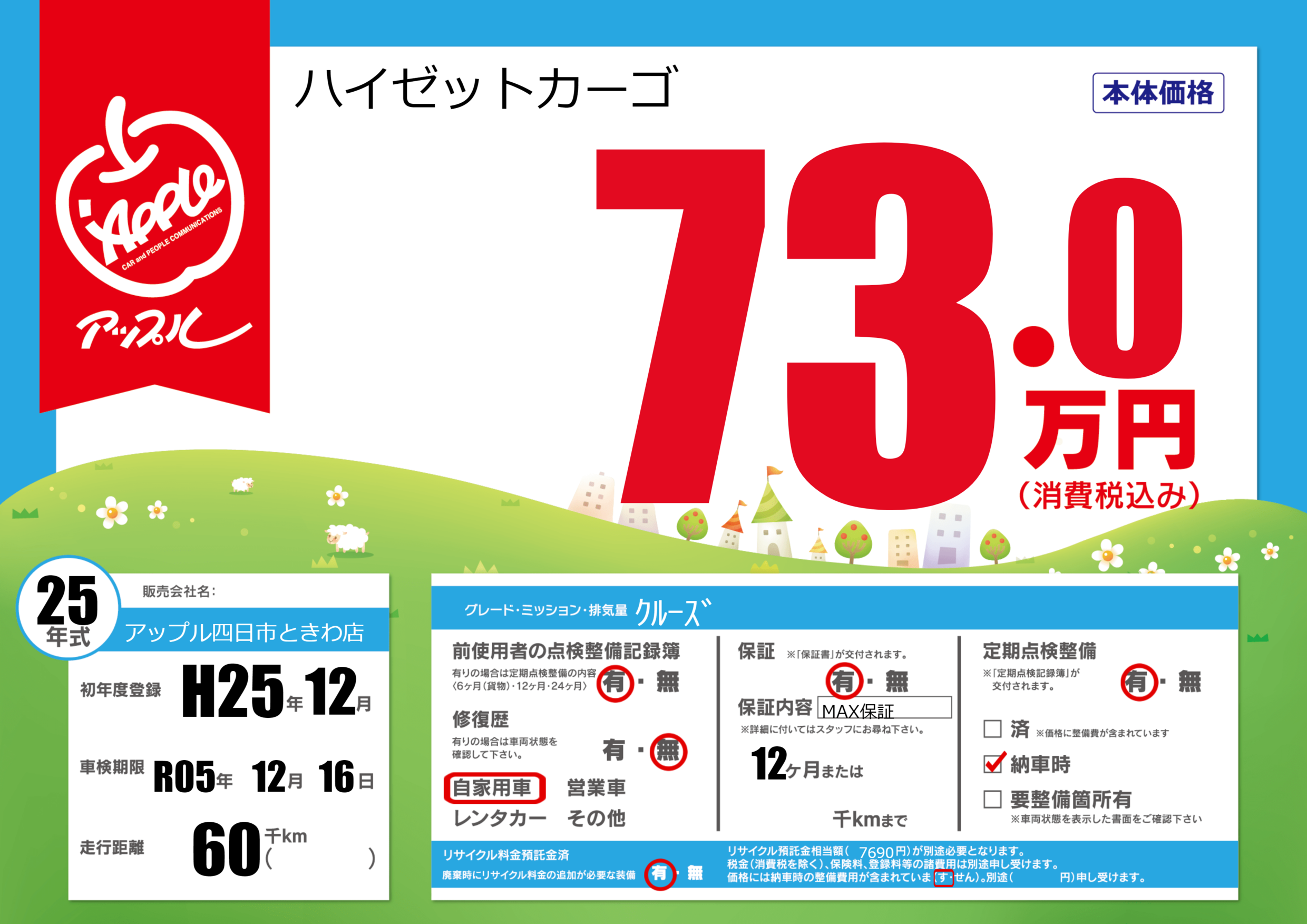 | 車名 | ハイゼットカーゴ | グレード ミッション 排気量 |