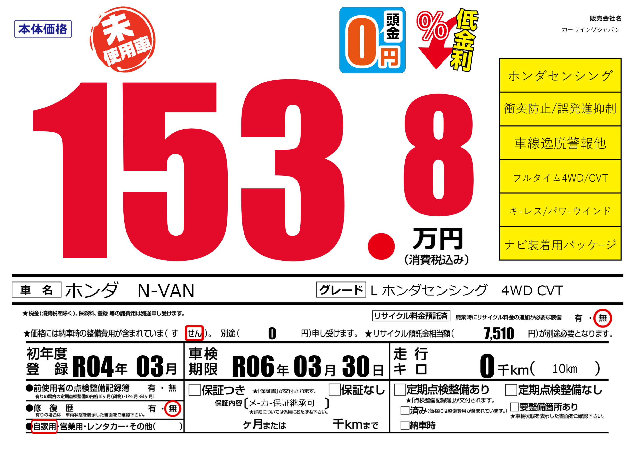 | 車名 | ホンダ N-VAN | グレード ミッション 排気量 |