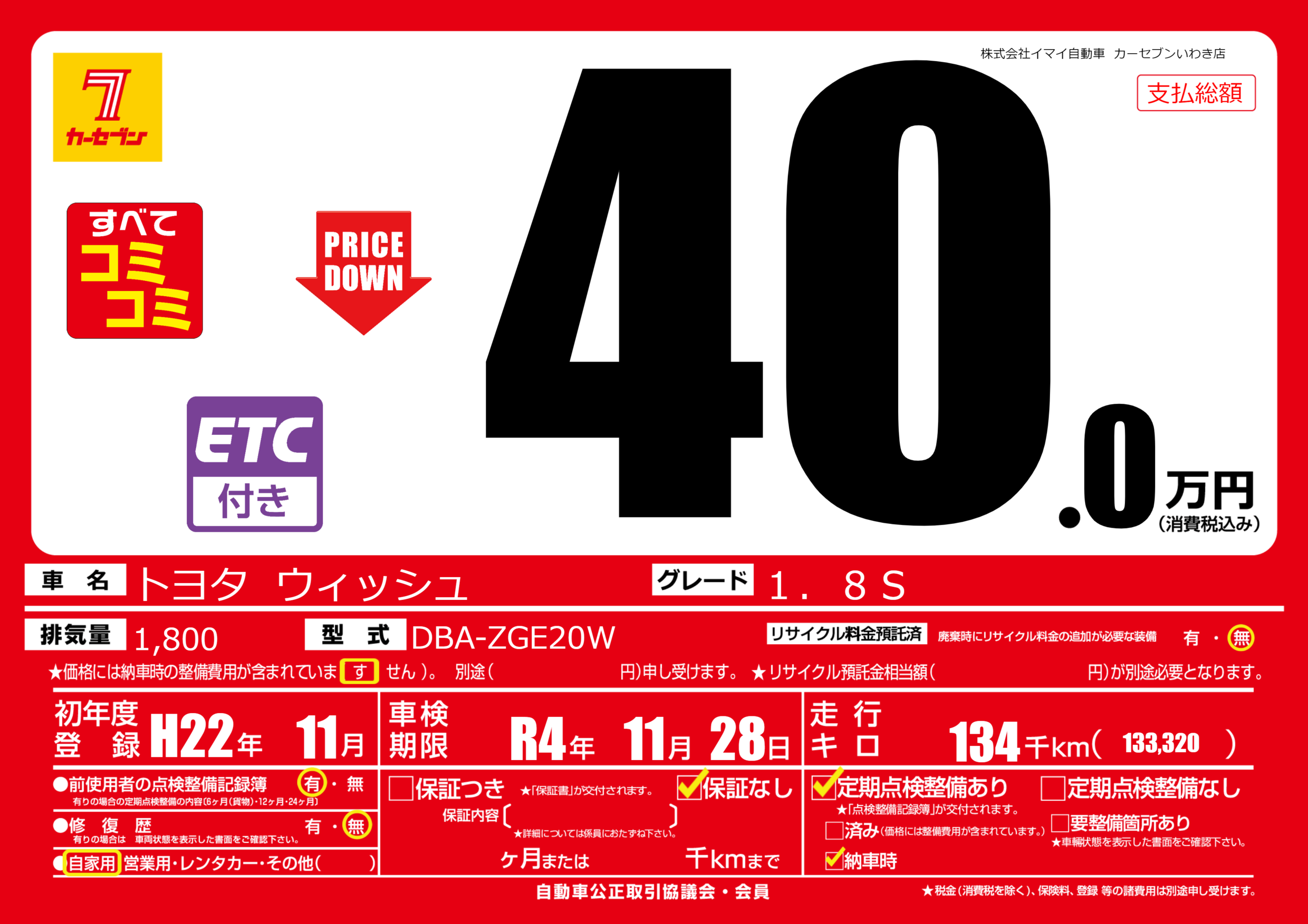 | 車名 | トヨタ ウィッシュ | グレード ミッション 排気量 |