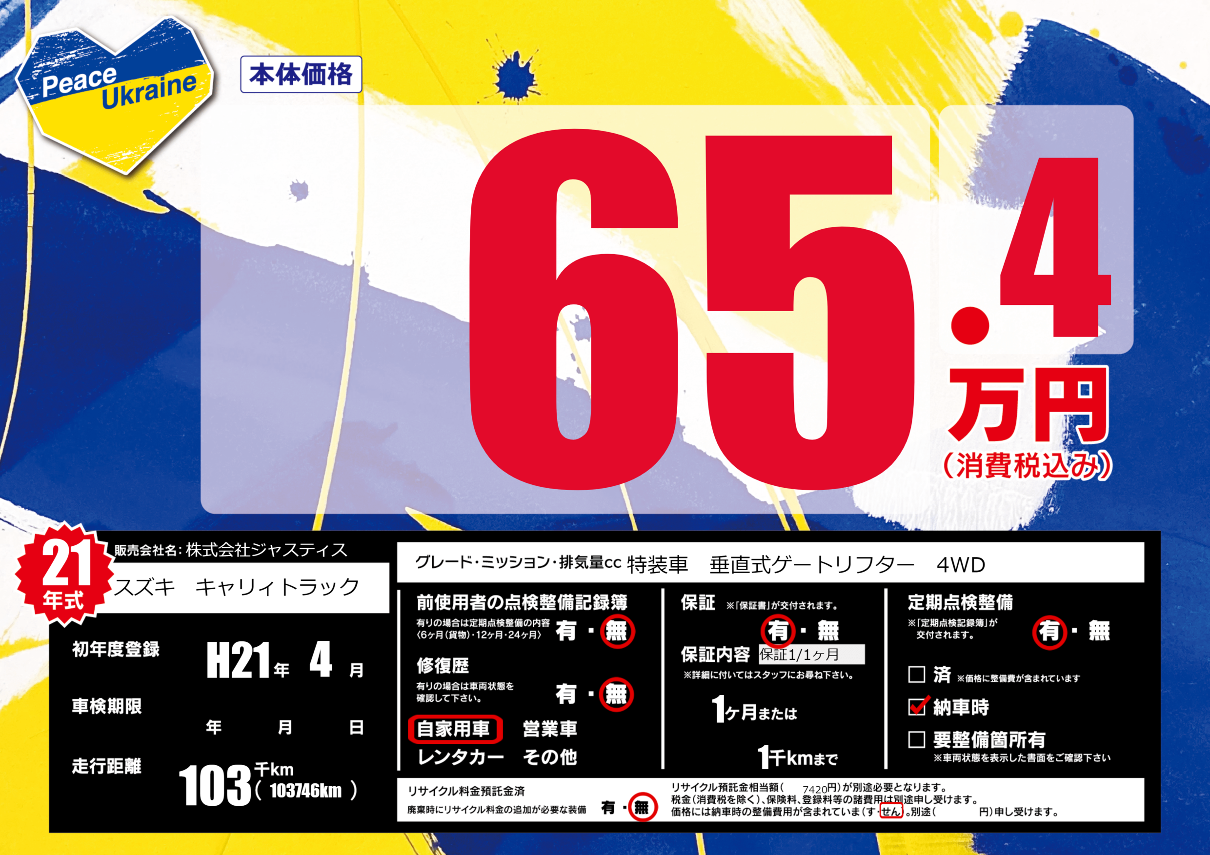 | 走行キロ | 10.3万km | 初年度登録 | H21年4月 |