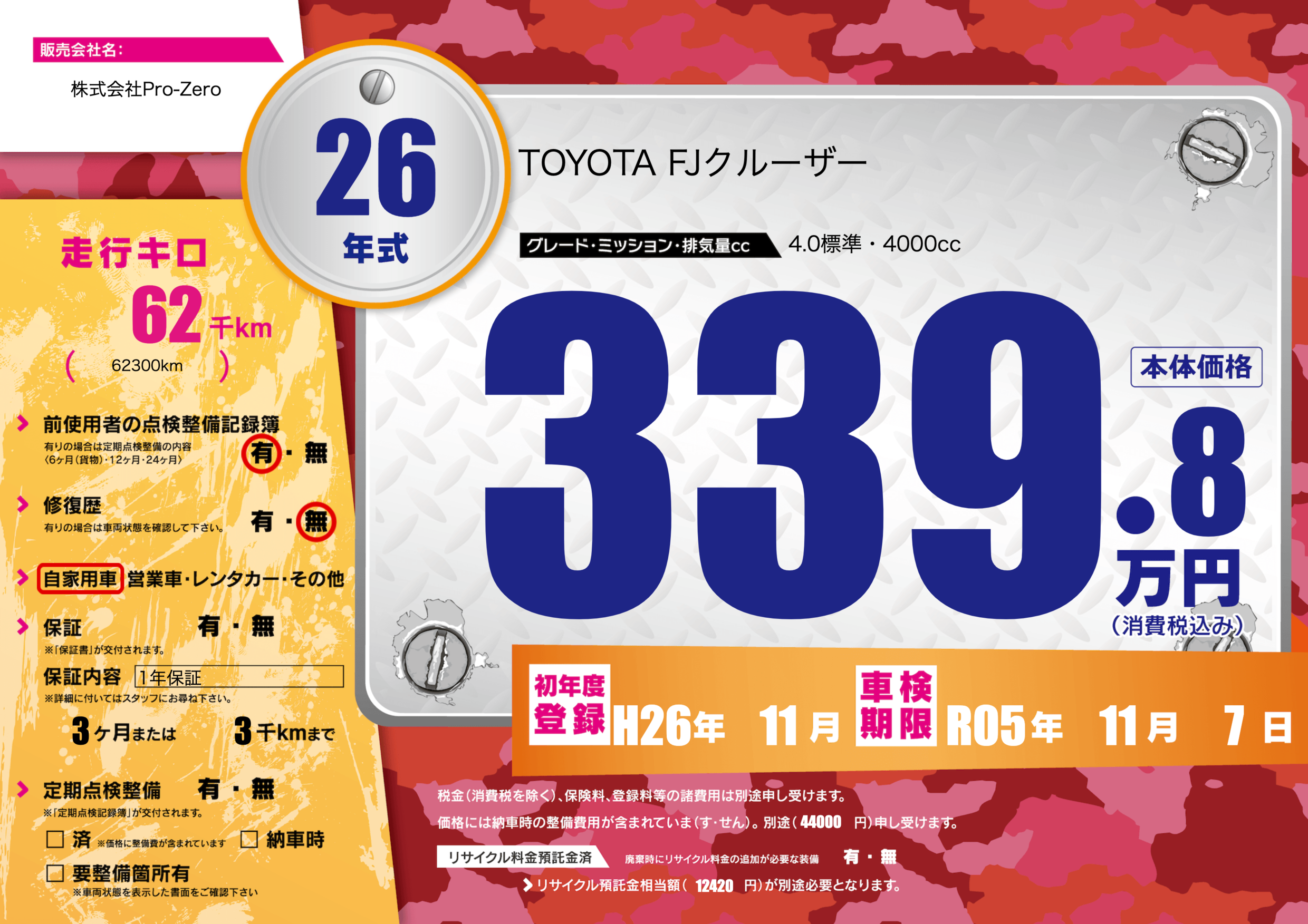 | 車名 | TOYOTA FJクルーザー | グレード ミッション 排気量 |