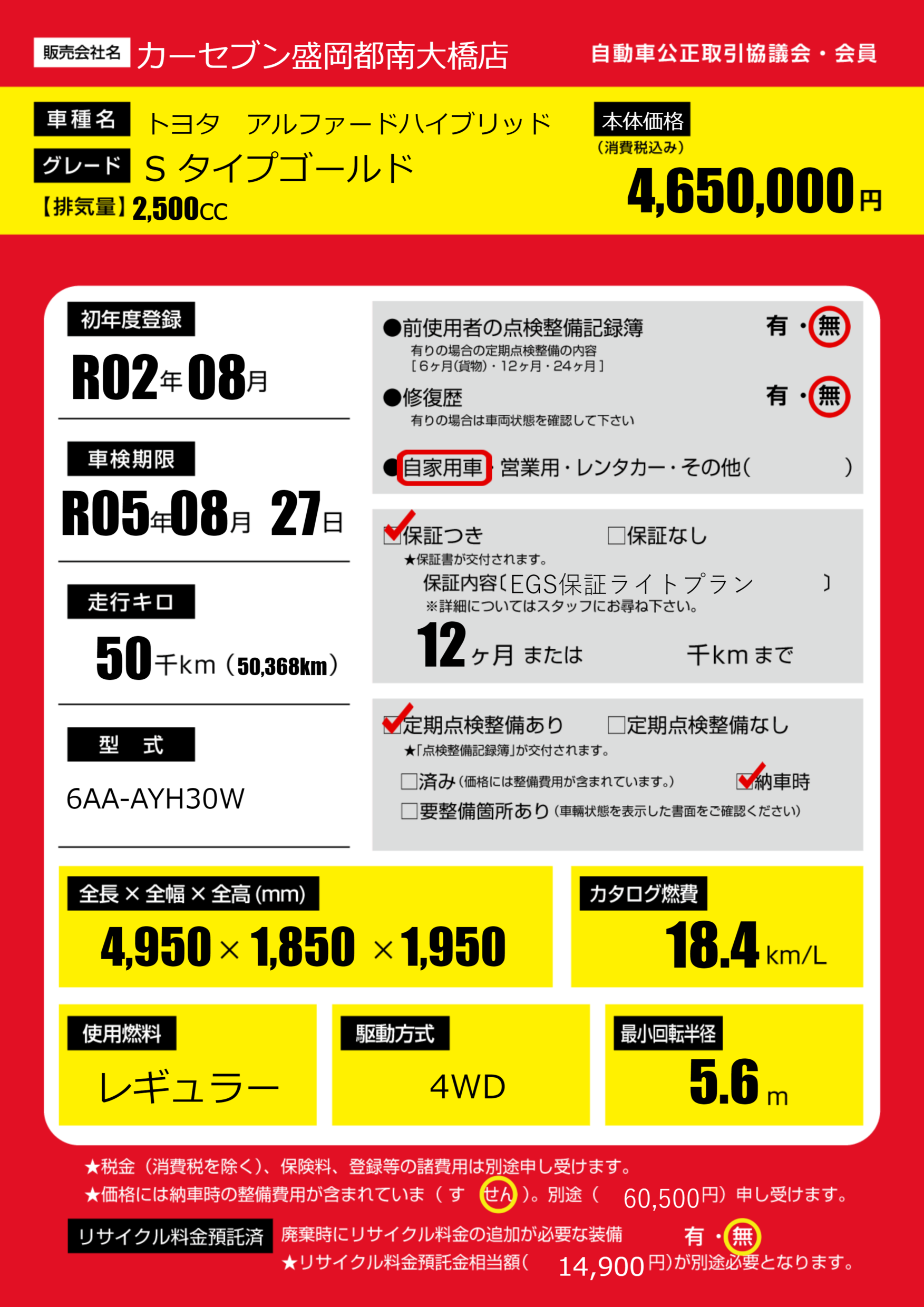 | 車名 | トヨタ アルファードハイブリッド | グレード ミッション 排気量 |