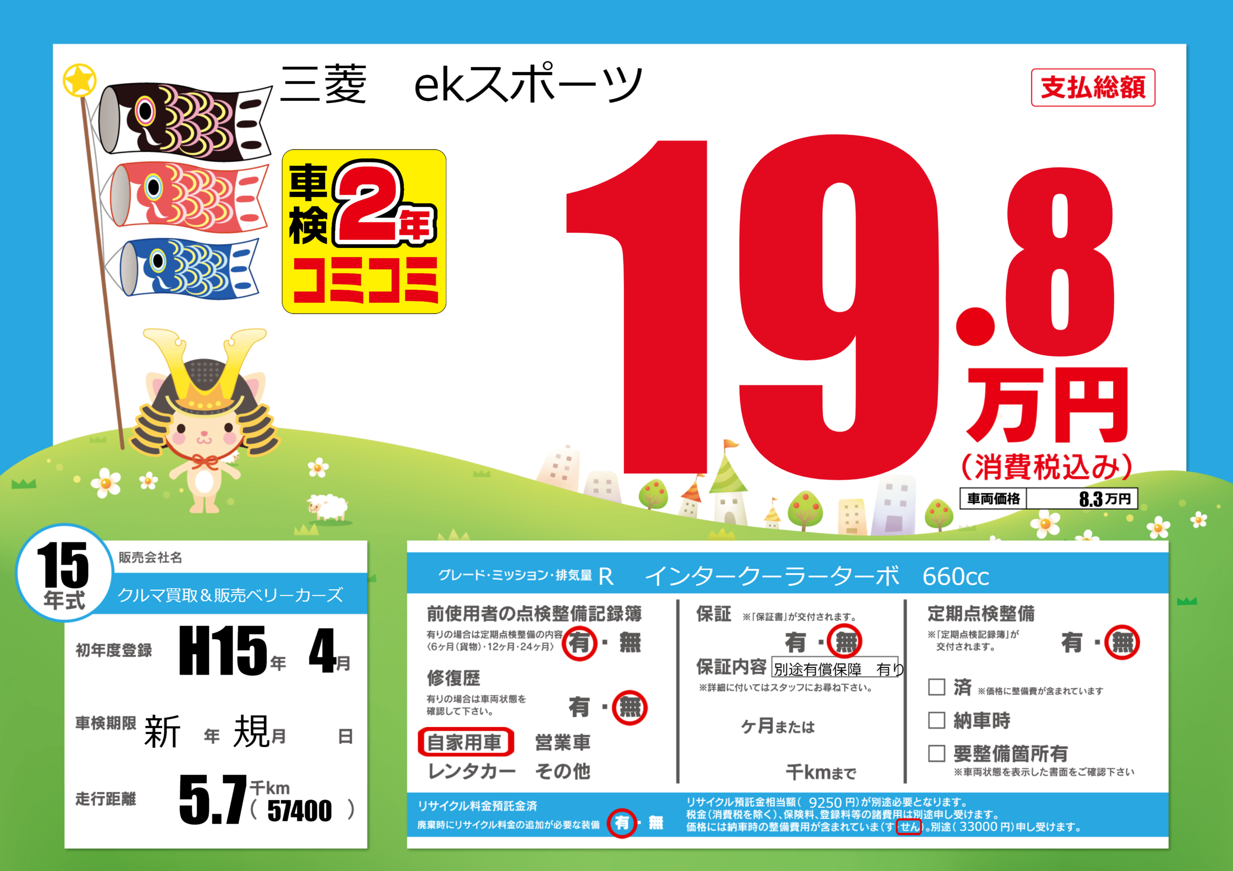 | 走行キロ | 0.5万km | 初年度登録 | H15年4月 |