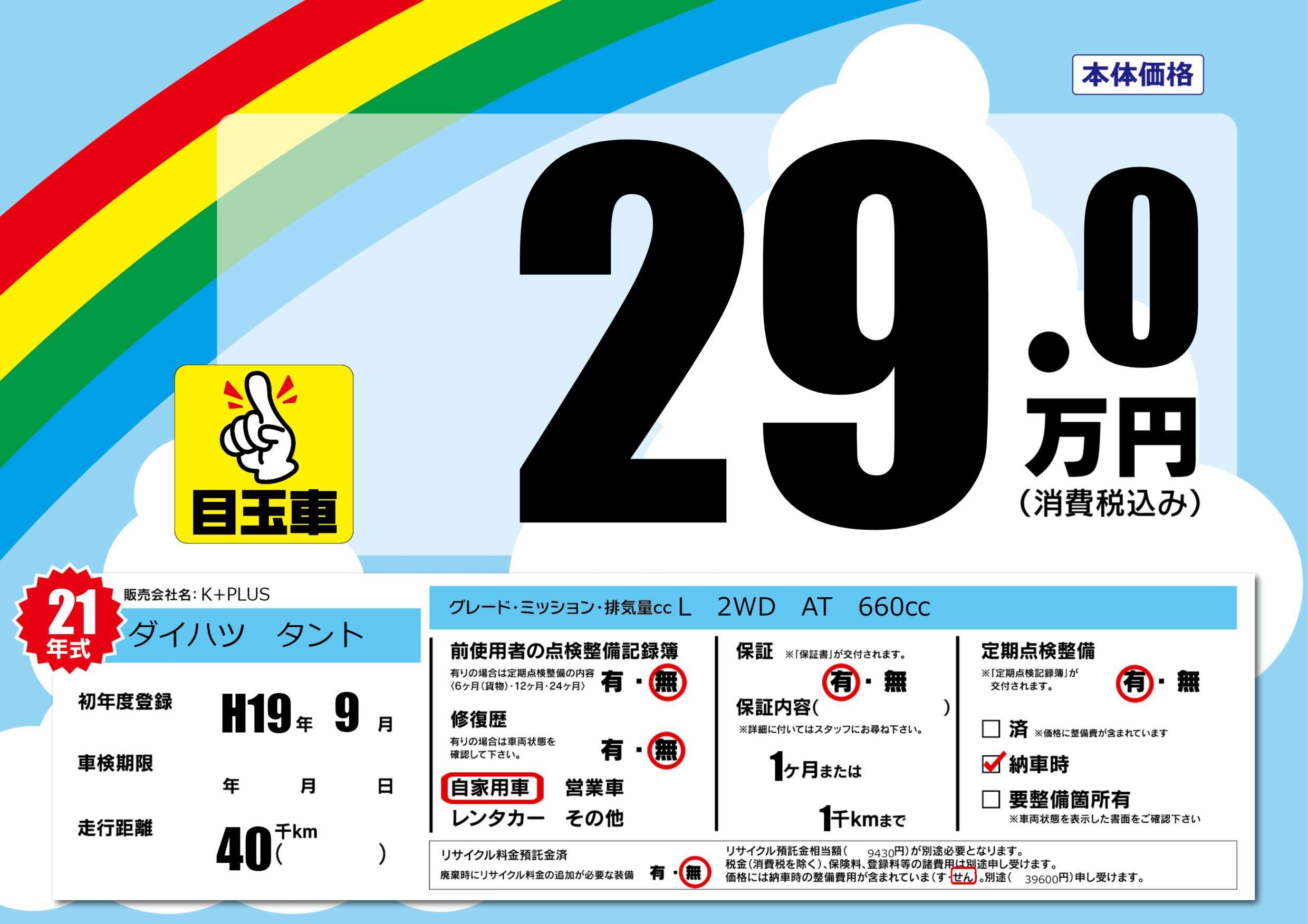 | 定期点検整備 | 定期点検整備あり 納車時あり | ||