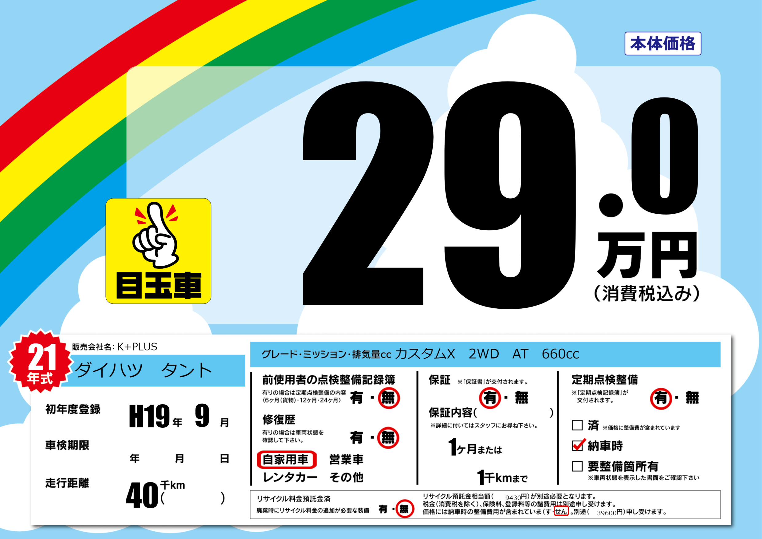 | 車名 | ダイハツ タント | グレード ミッション 排気量 |