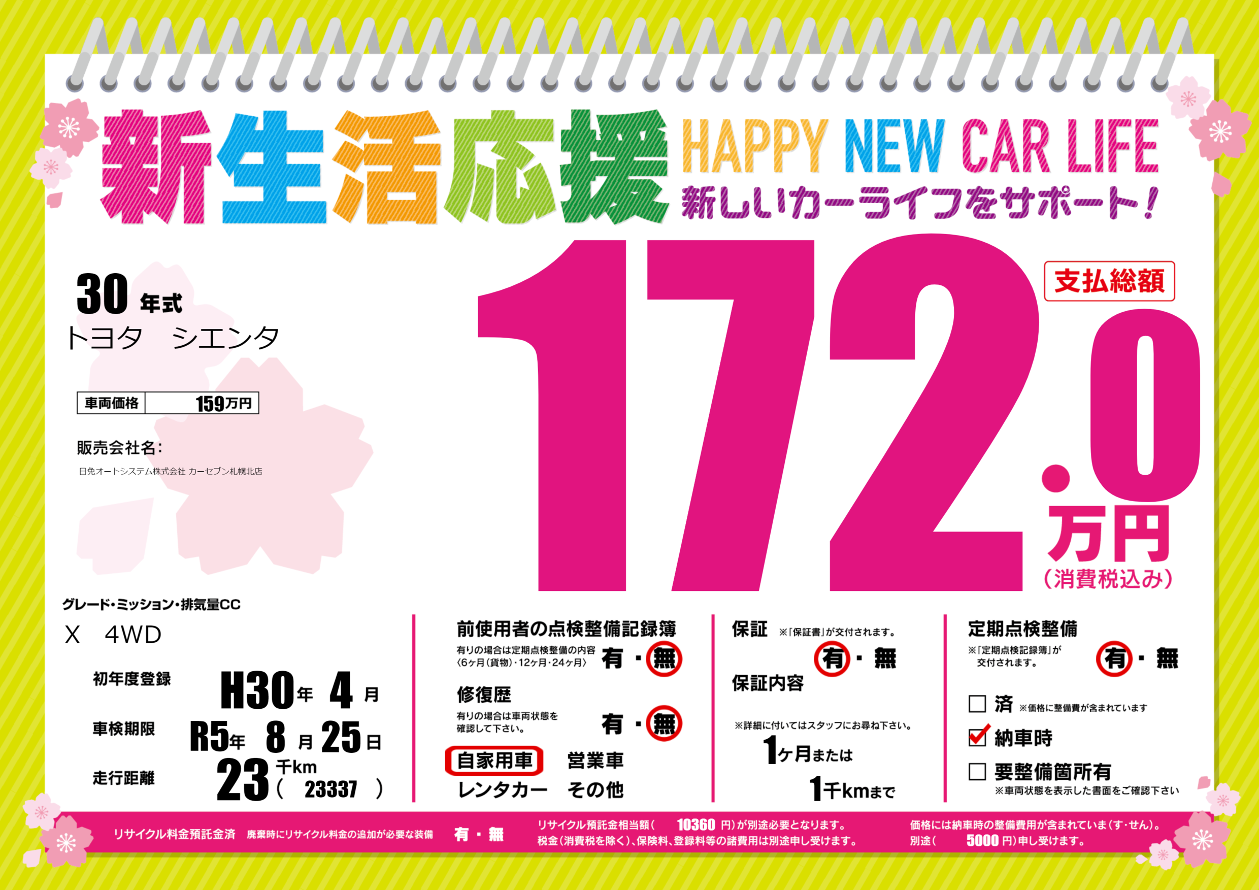 | 車名 | トヨタ シエンタ | グレード ミッション 排気量 |