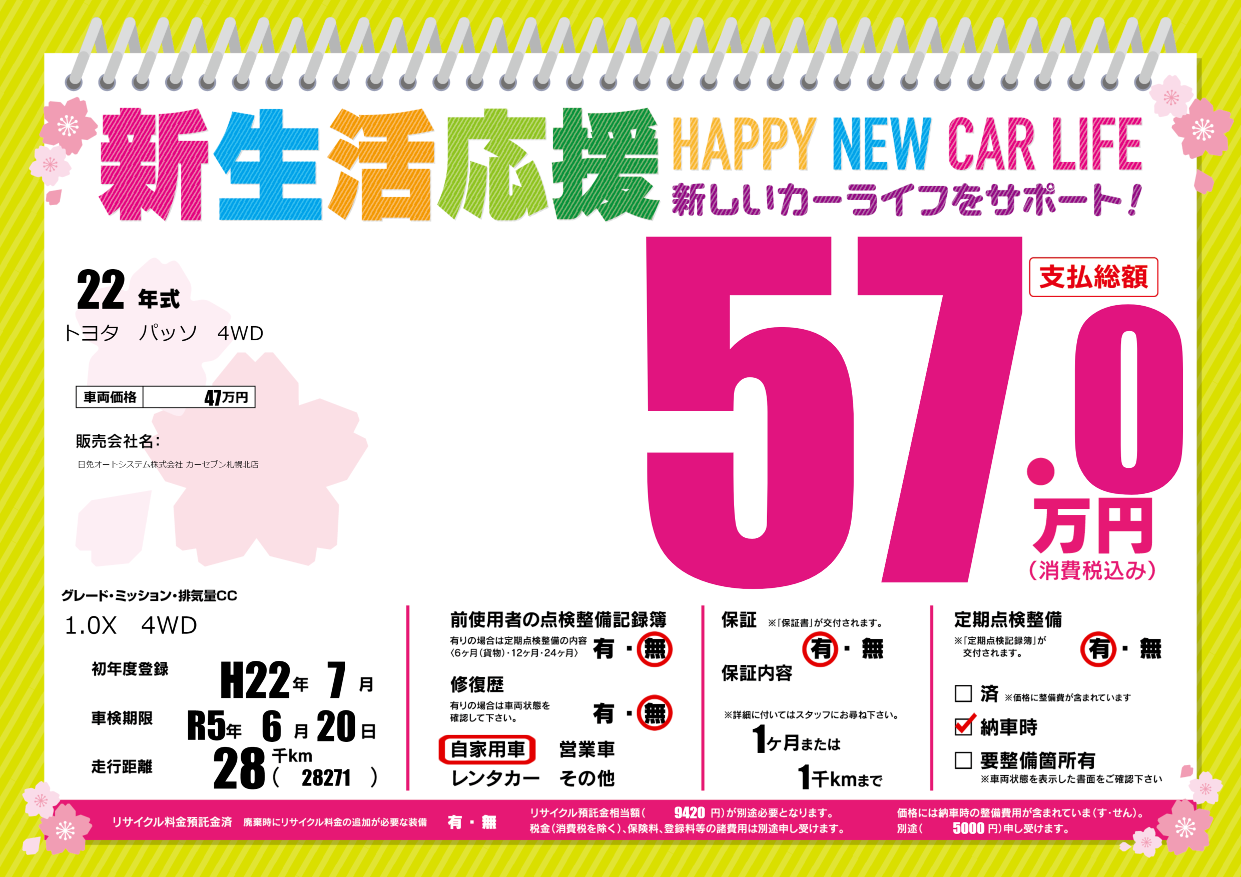 | 車名 | トヨタ パッソ 4WD | グレード ミッション 排気量 |