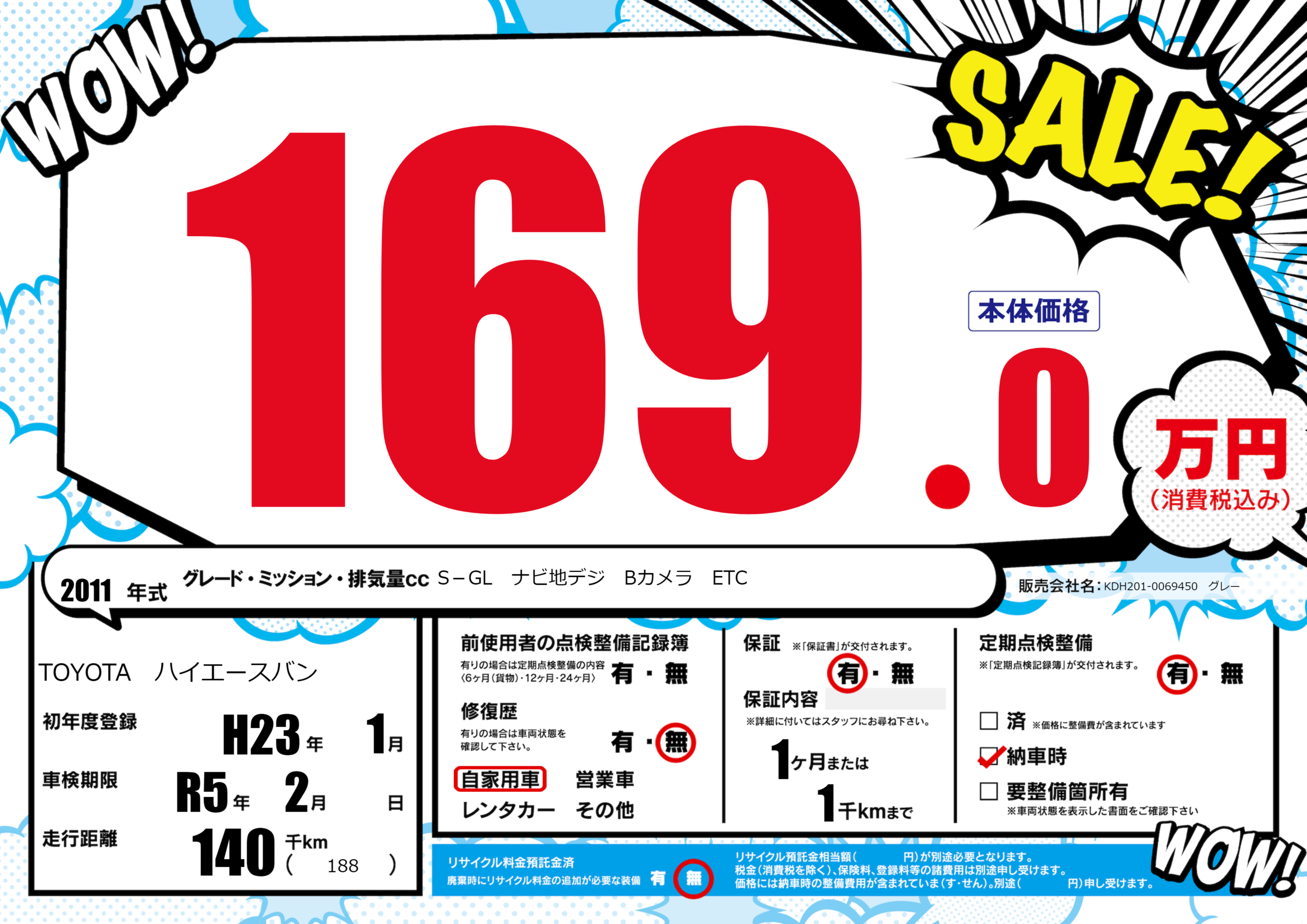| 車名 | TOYOTA ハイエースバン | グレード ミッション 排気量 |