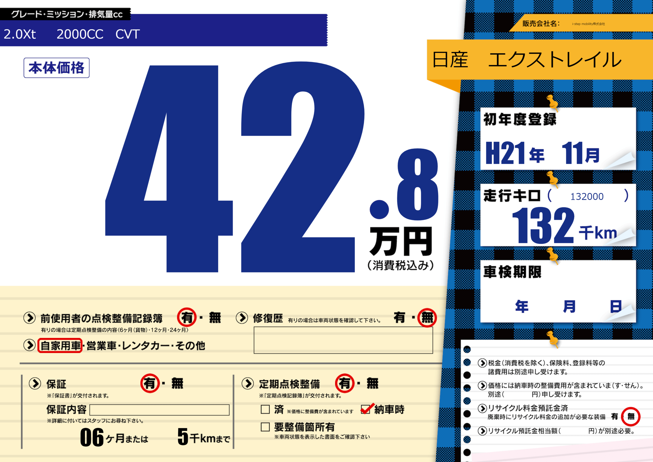 | 車名 | 日産 エクストレイル | グレード ミッション 排気量 |