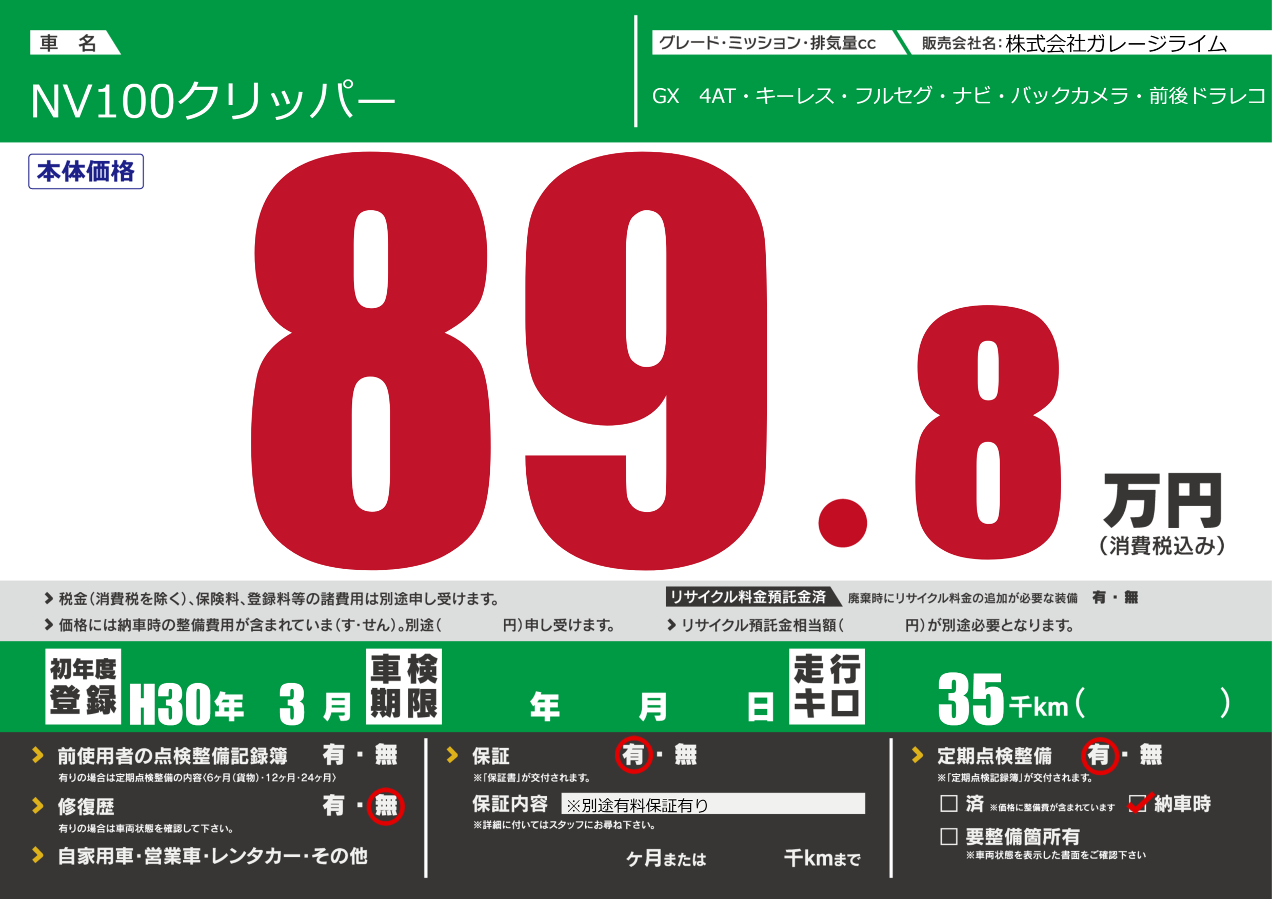 | 定期点検整備 | 定期点検整備あり 納車時あり | ||