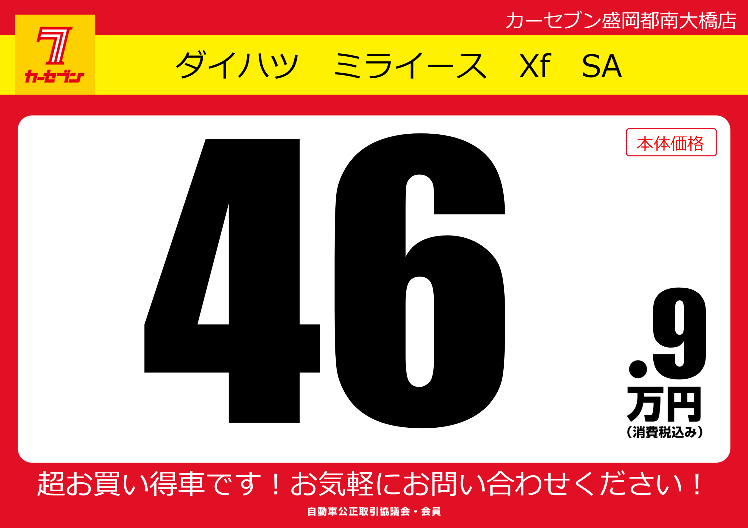 | 車名 | ダイハツ ミライース Xf SA | グレード ミッション 排気量 |