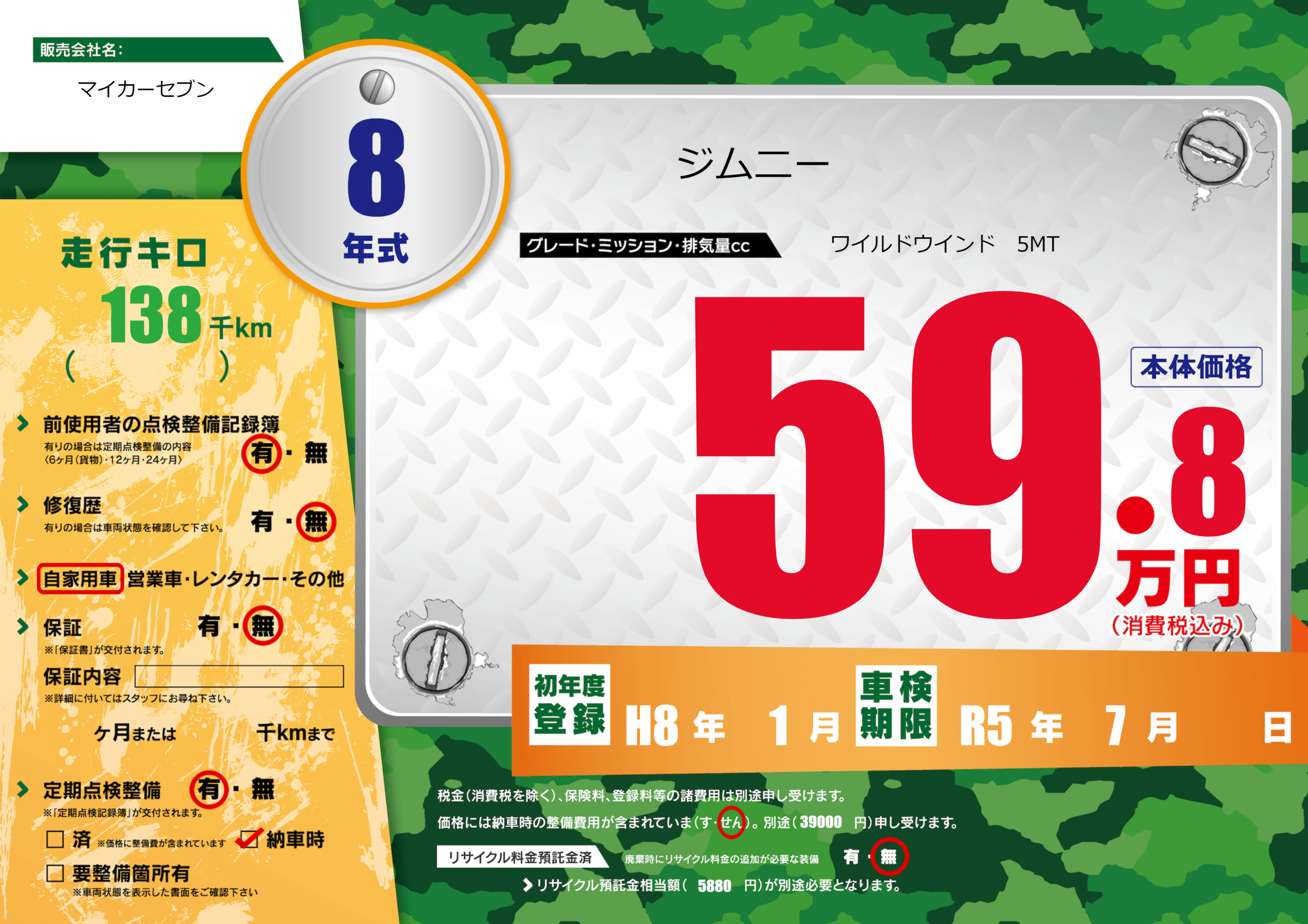 | 走行キロ | 13.8万km | 初年度登録 | H8年1月 |
