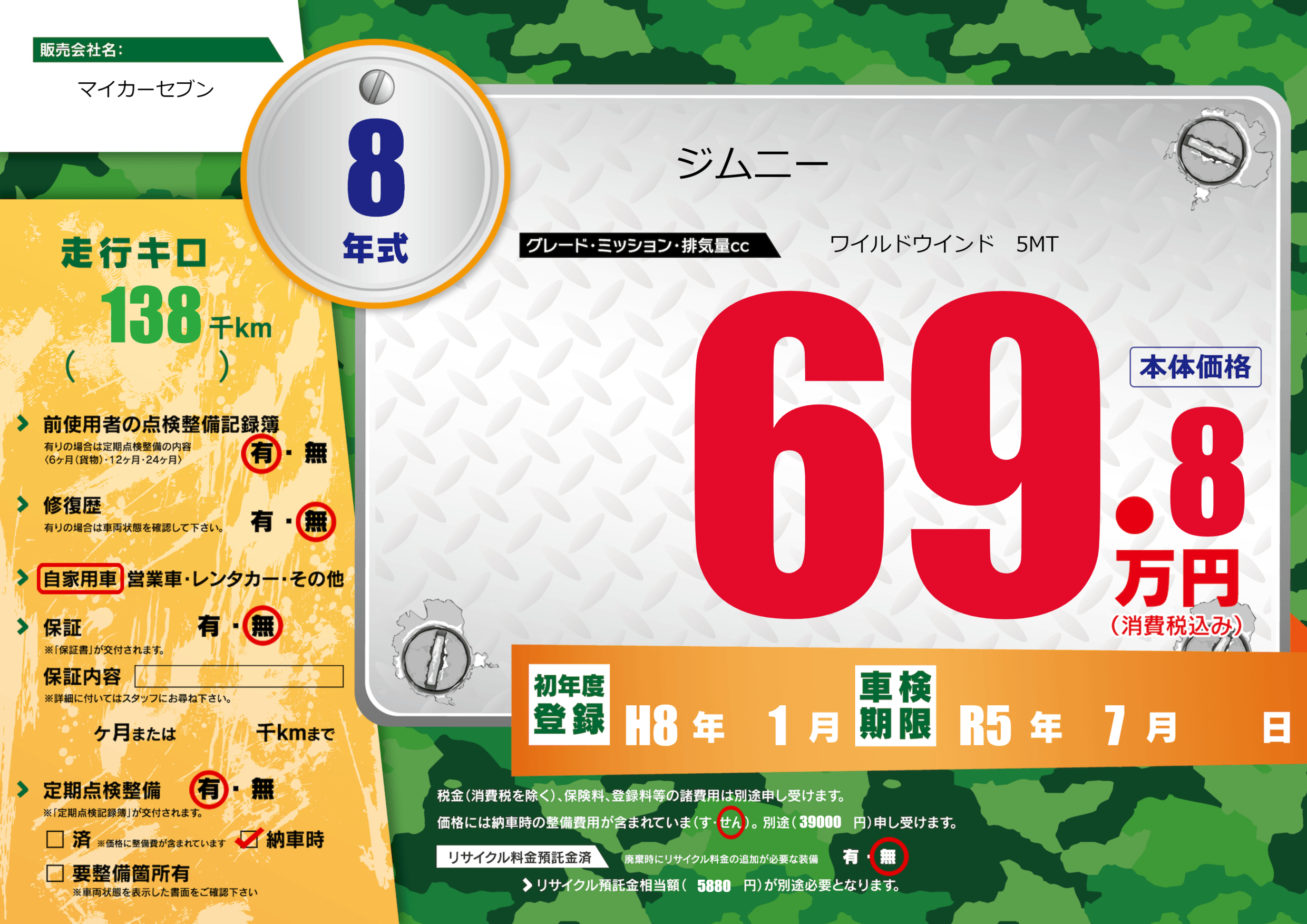 | 走行キロ | 13.8万km | 初年度登録 | H8年1月 |