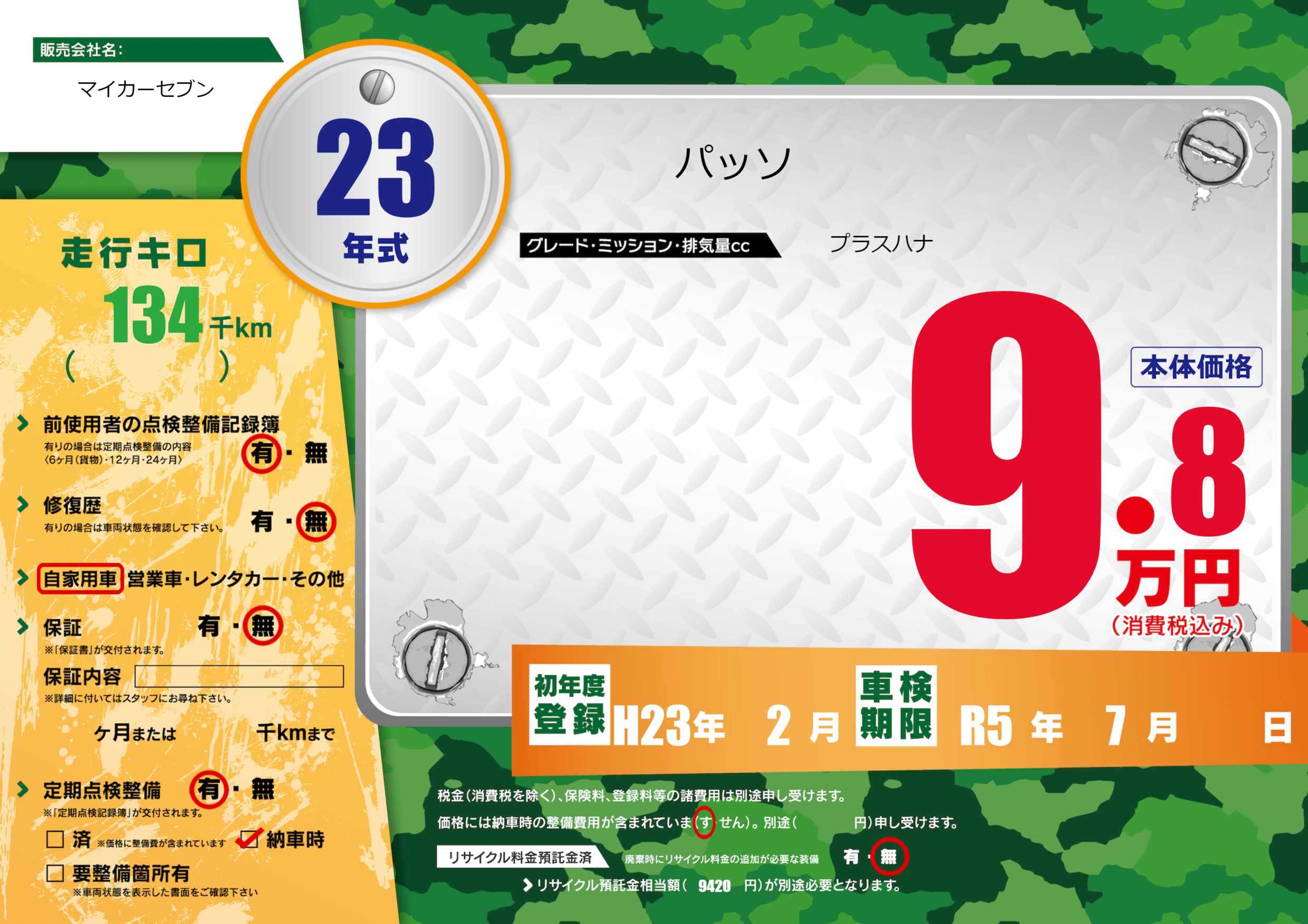 | 車名 | パッソ | グレード ミッション 排気量 |