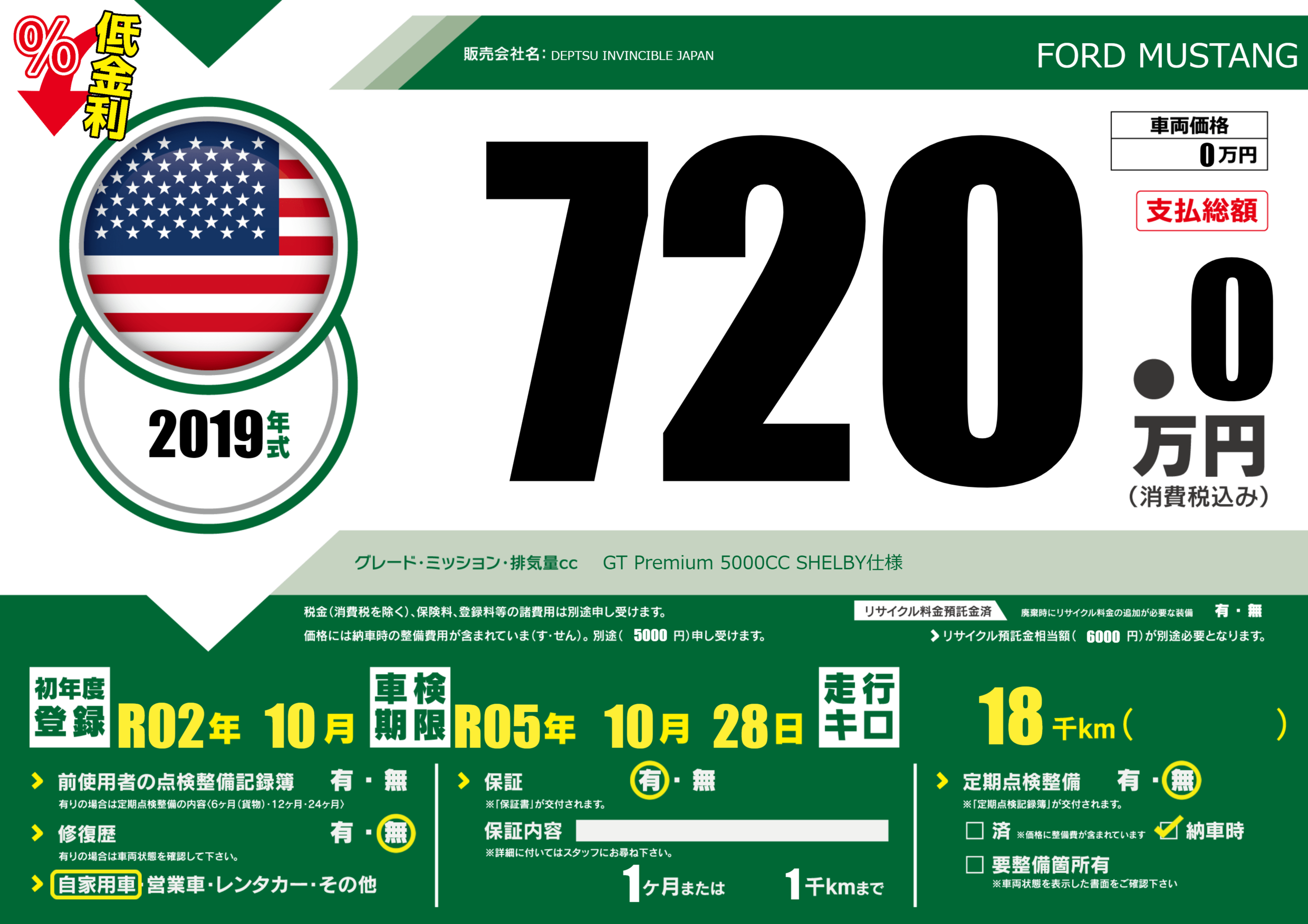 | 車名 | FORD MUSTANG | グレード ミッション 排気量 |