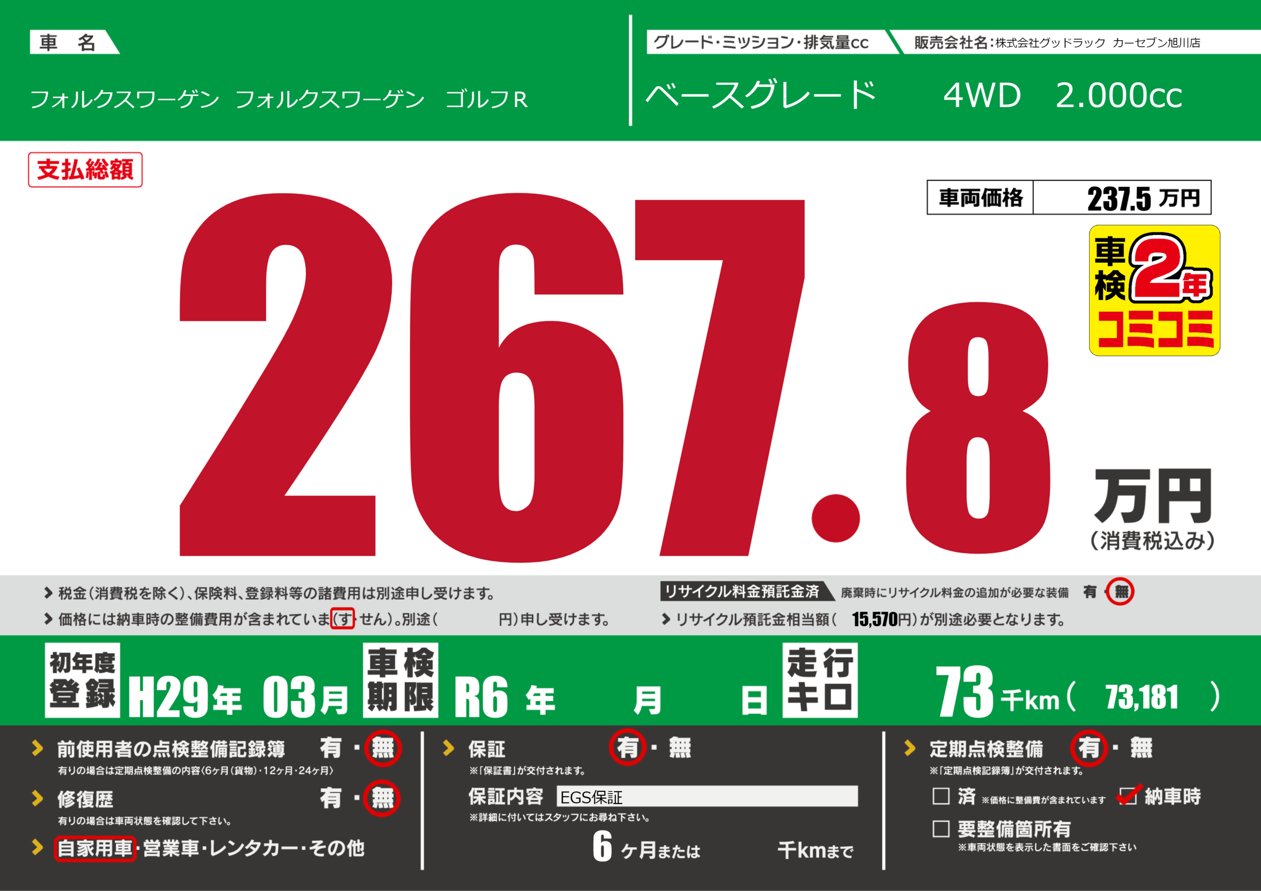 | 車名 | フォルクスワーゲン フォルクスワーゲン ゴルフR | グレード ミッション 排気量 |