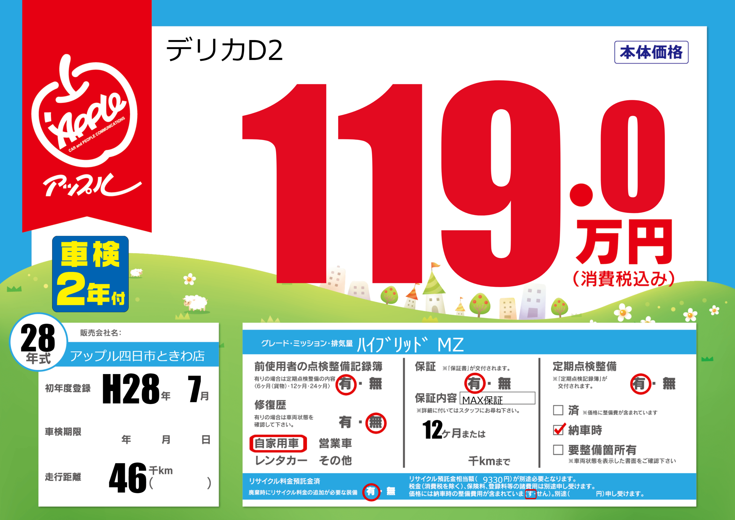| 車名 | デリカD2 | グレード ミッション 排気量 |