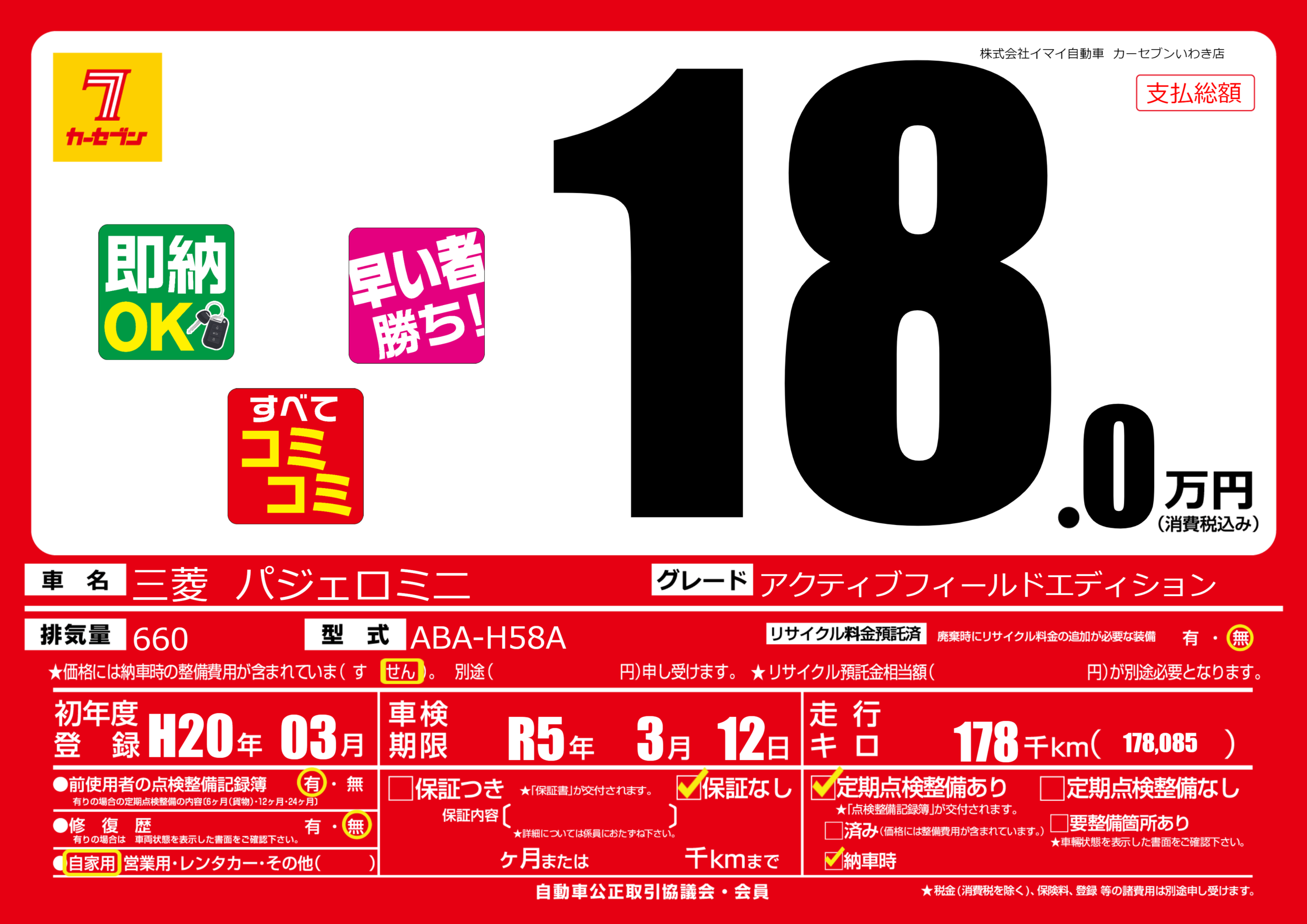 | 車名 | 三菱 パジェロミニ | グレード ミッション 排気量 |