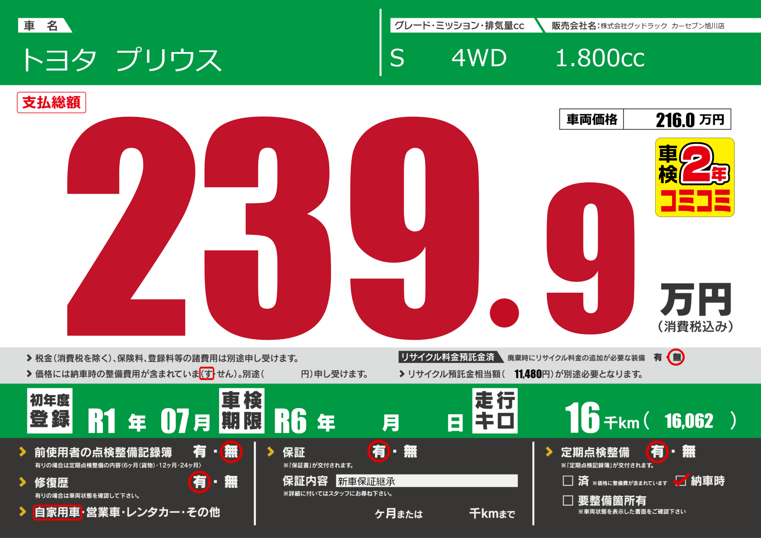 | 車名 | トヨタ プリウス | グレード ミッション 排気量 |