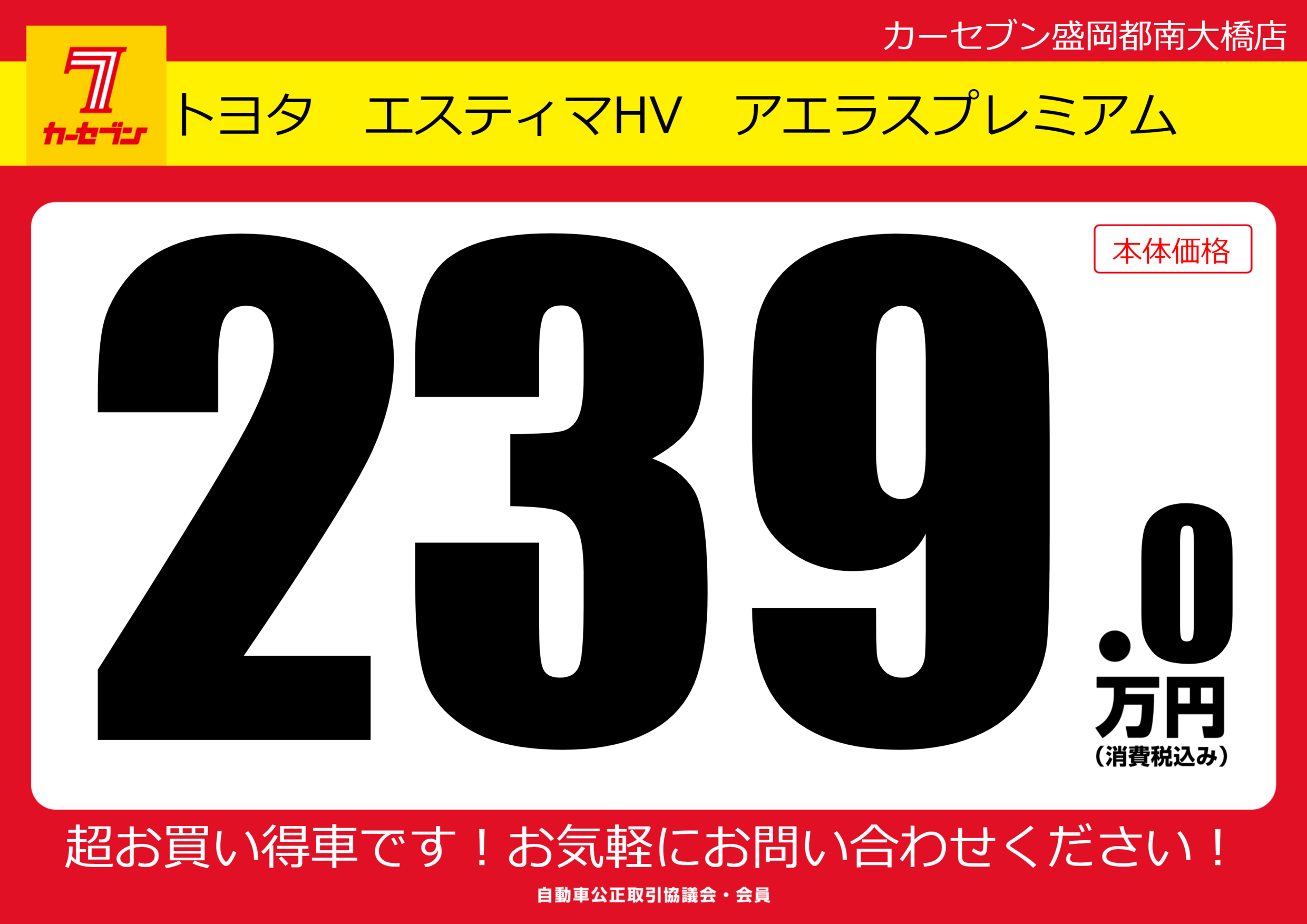 | 車名 | トヨタ エスティマHV アエラスプレミアム | グレード ミッション 排気量 |