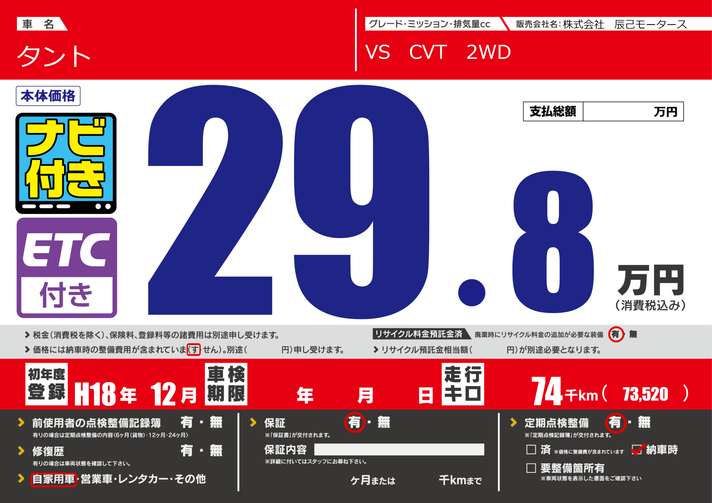 | 走行キロ | 7.4万km | 初年度登録 | H18年12月 |
