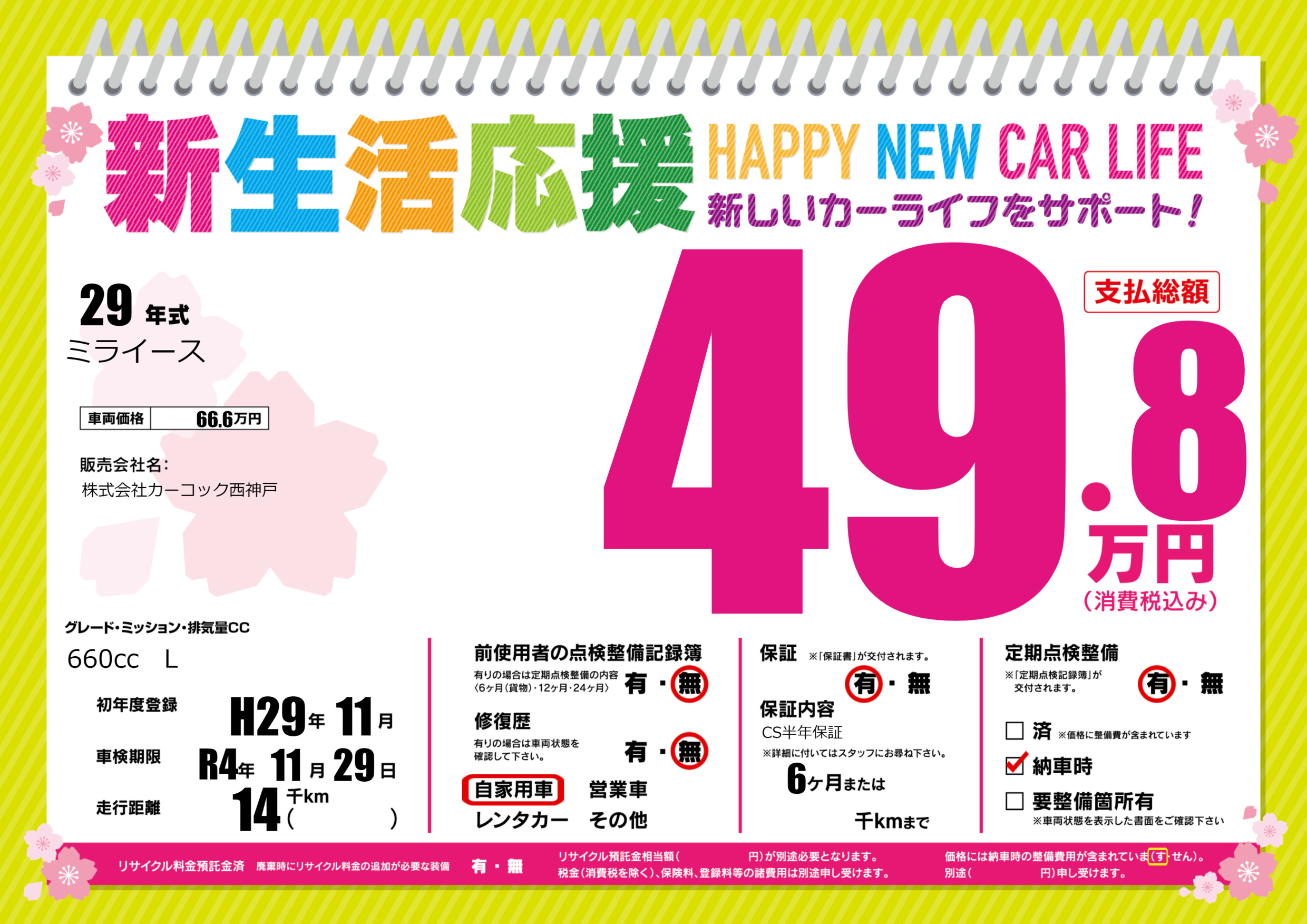 | 定期点検整備 | 定期点検整備あり 納車時あり | ||
