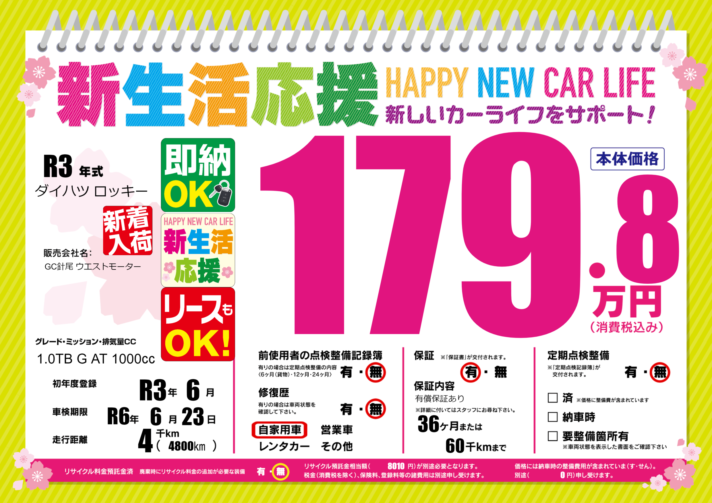 | 車名 | ダイハツ ロッキー | グレード ミッション 排気量 |