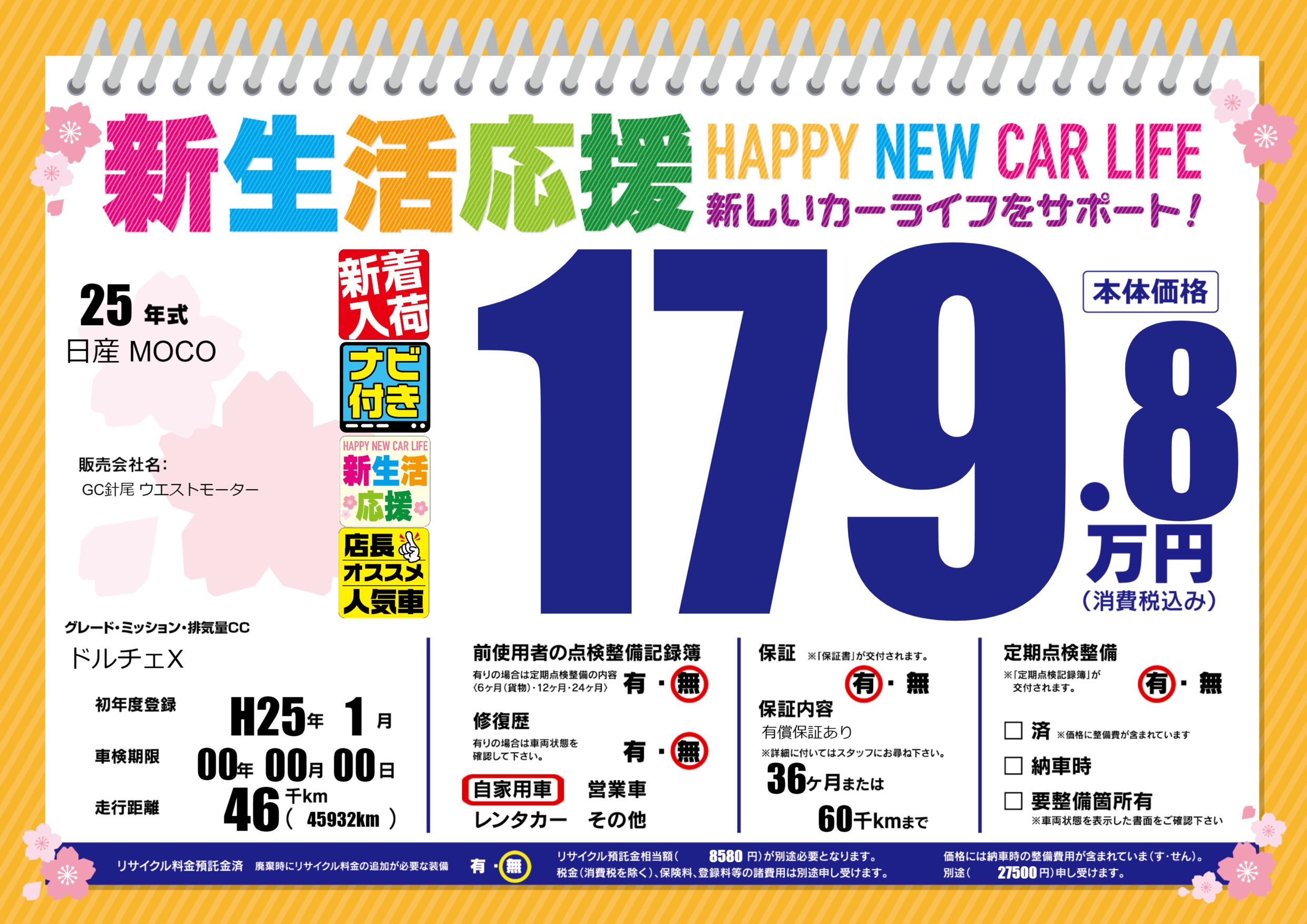 | 車名 | 日産 MOCO | グレード ミッション 排気量 |