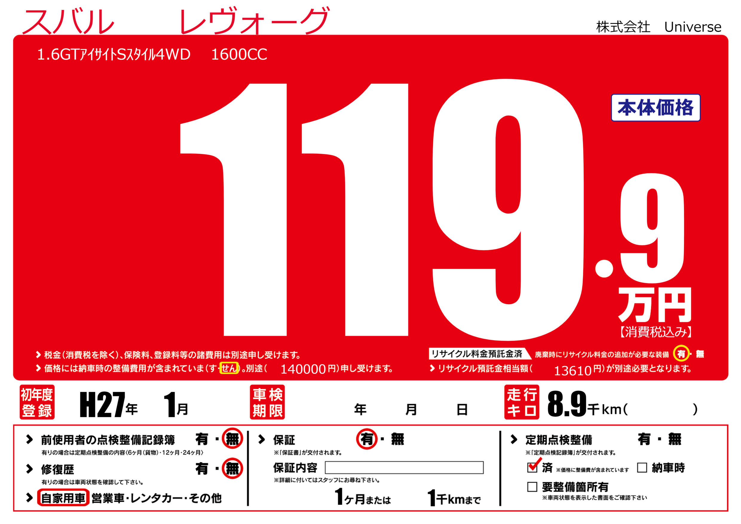 | 車名 | スバル レヴォーグ | グレード ミッション 排気量 |