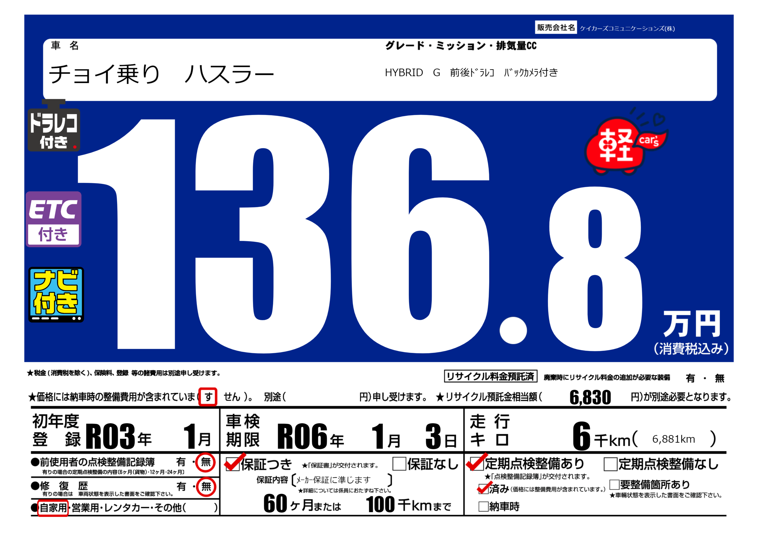 | 車名 | チョイ乗り ハスラー | グレード ミッション 排気量 |
