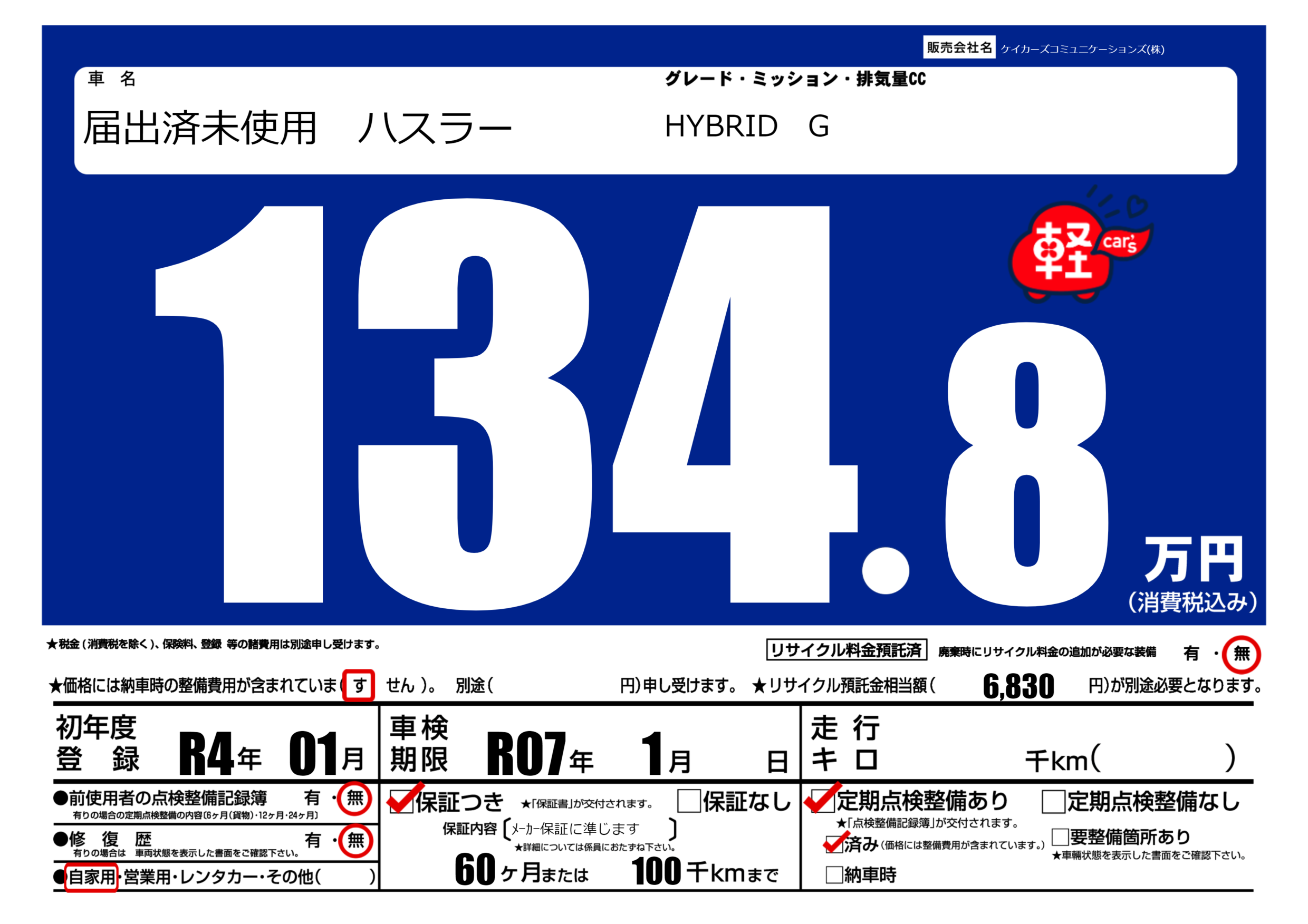 | 車名 | 届出済未使用 ハスラー | グレード ミッション 排気量 |