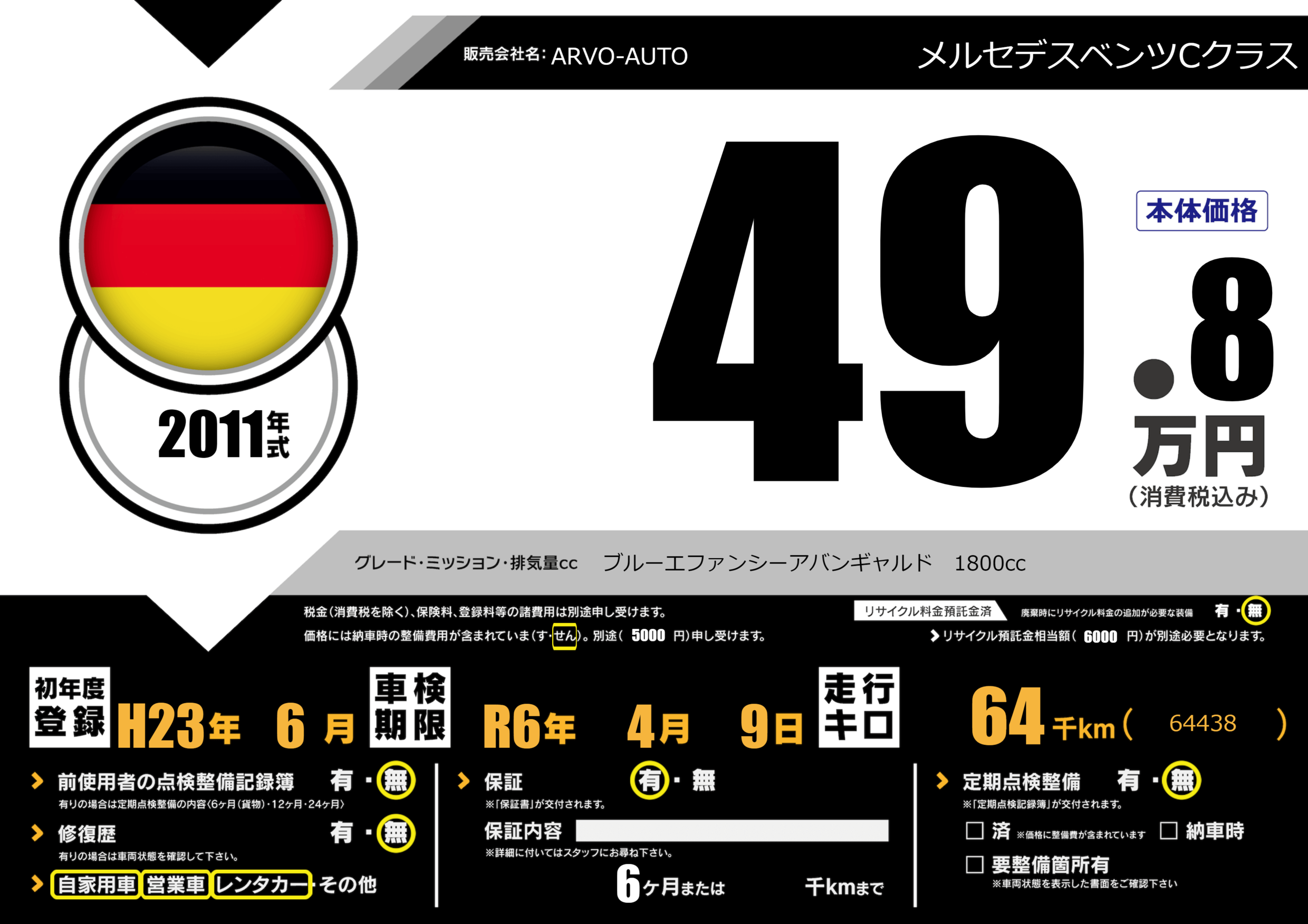 | 車名 | メルセデスベンツCクラス | グレード ミッション 排気量 |