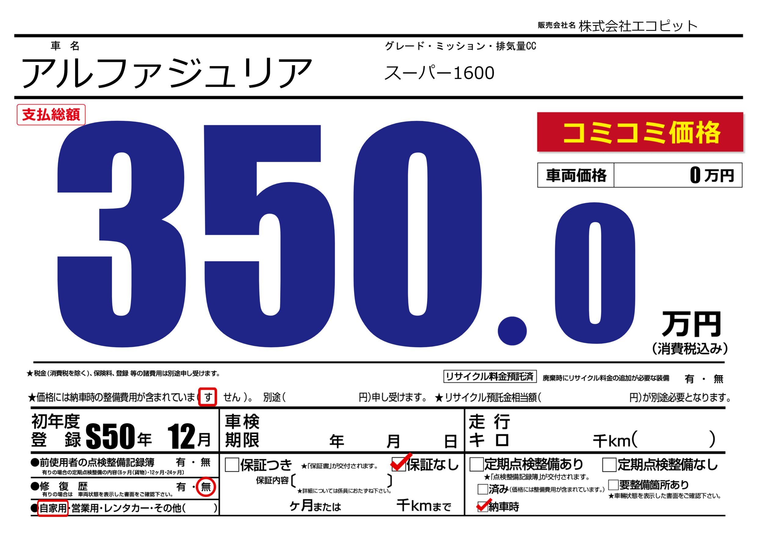 | 車検制限 | - 年 - 月 - 日 | ||