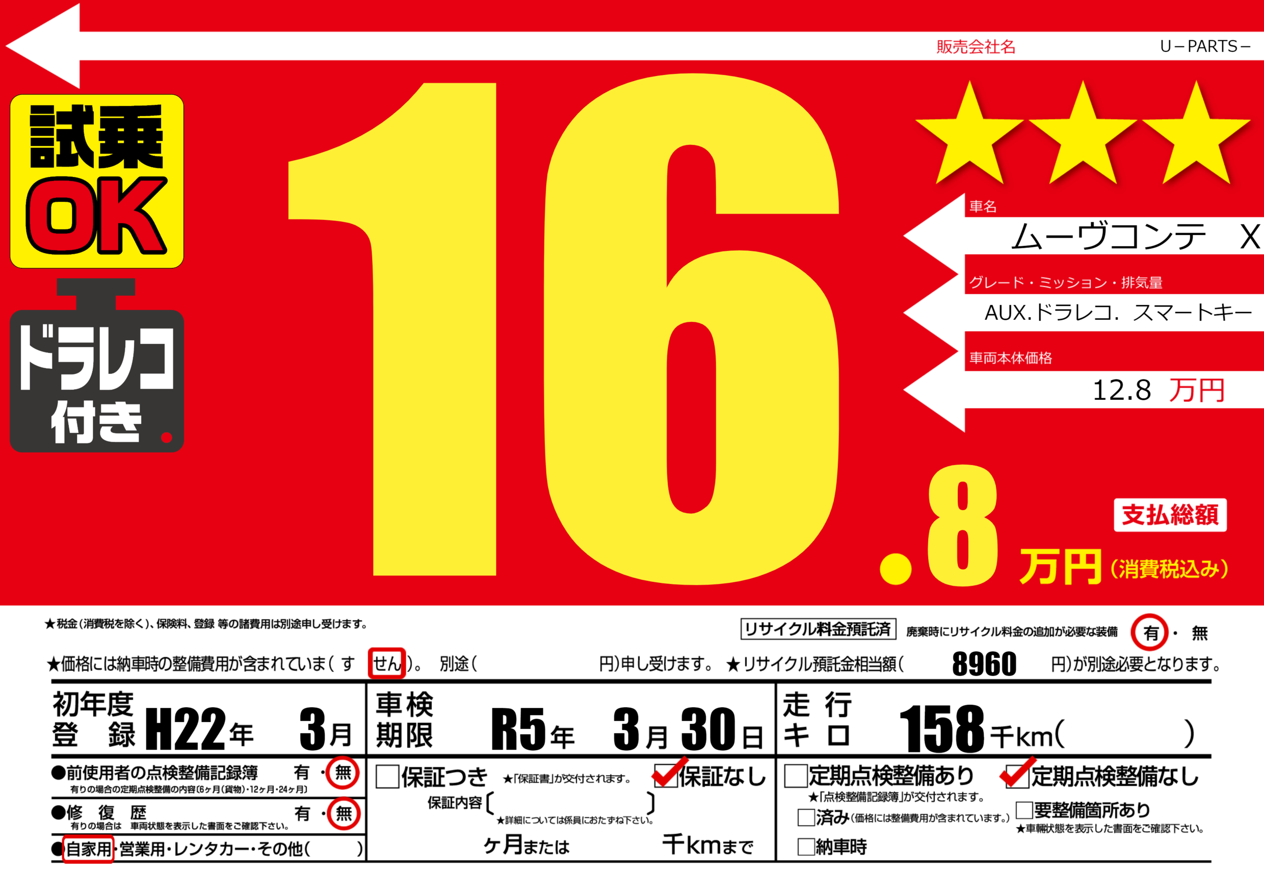 | 走行キロ | 15.8万km | 初年度登録 | H22年3月 |