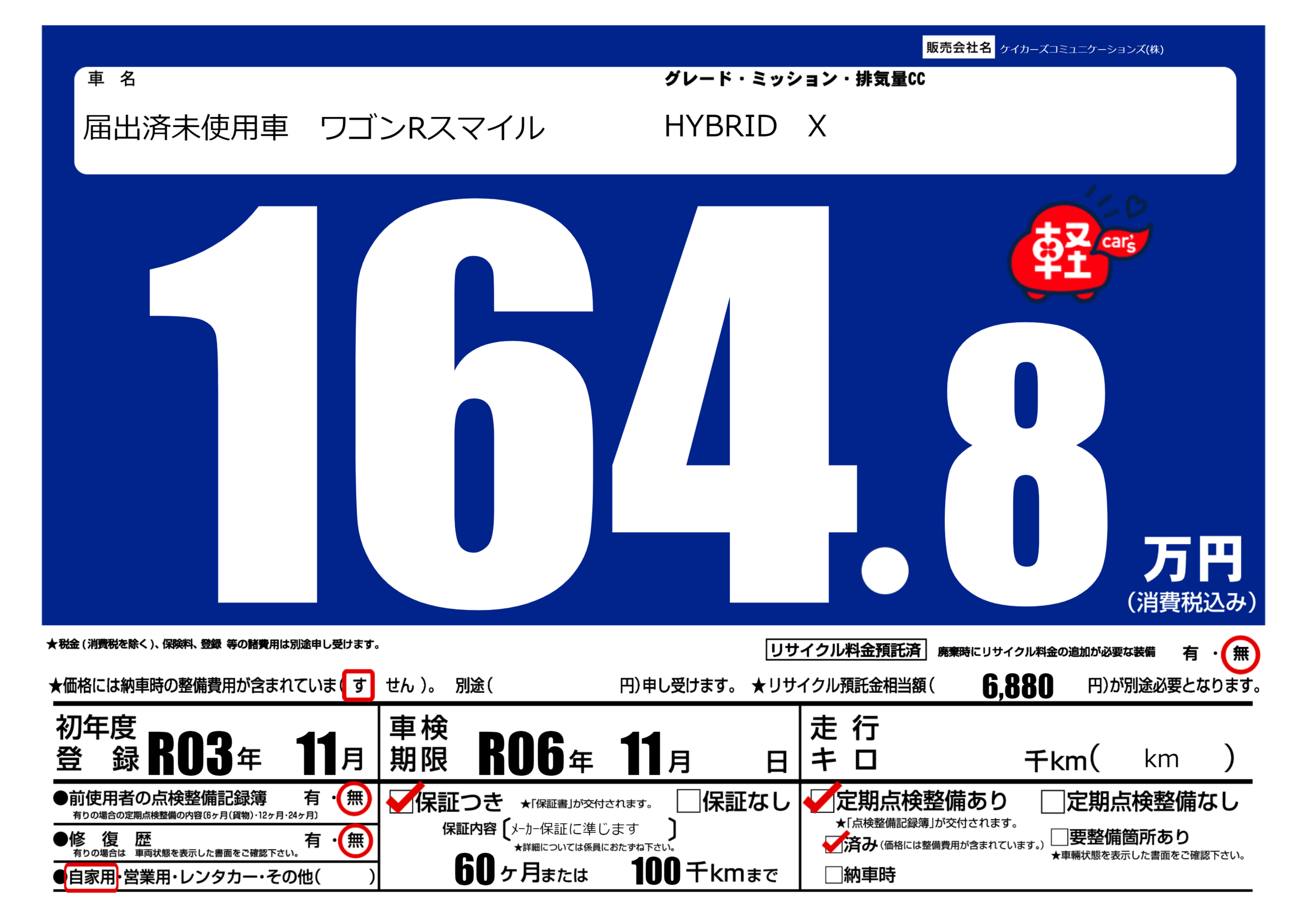 | 車名 | 届出済未使用車 ワゴンRスマイル | グレード ミッション 排気量 |