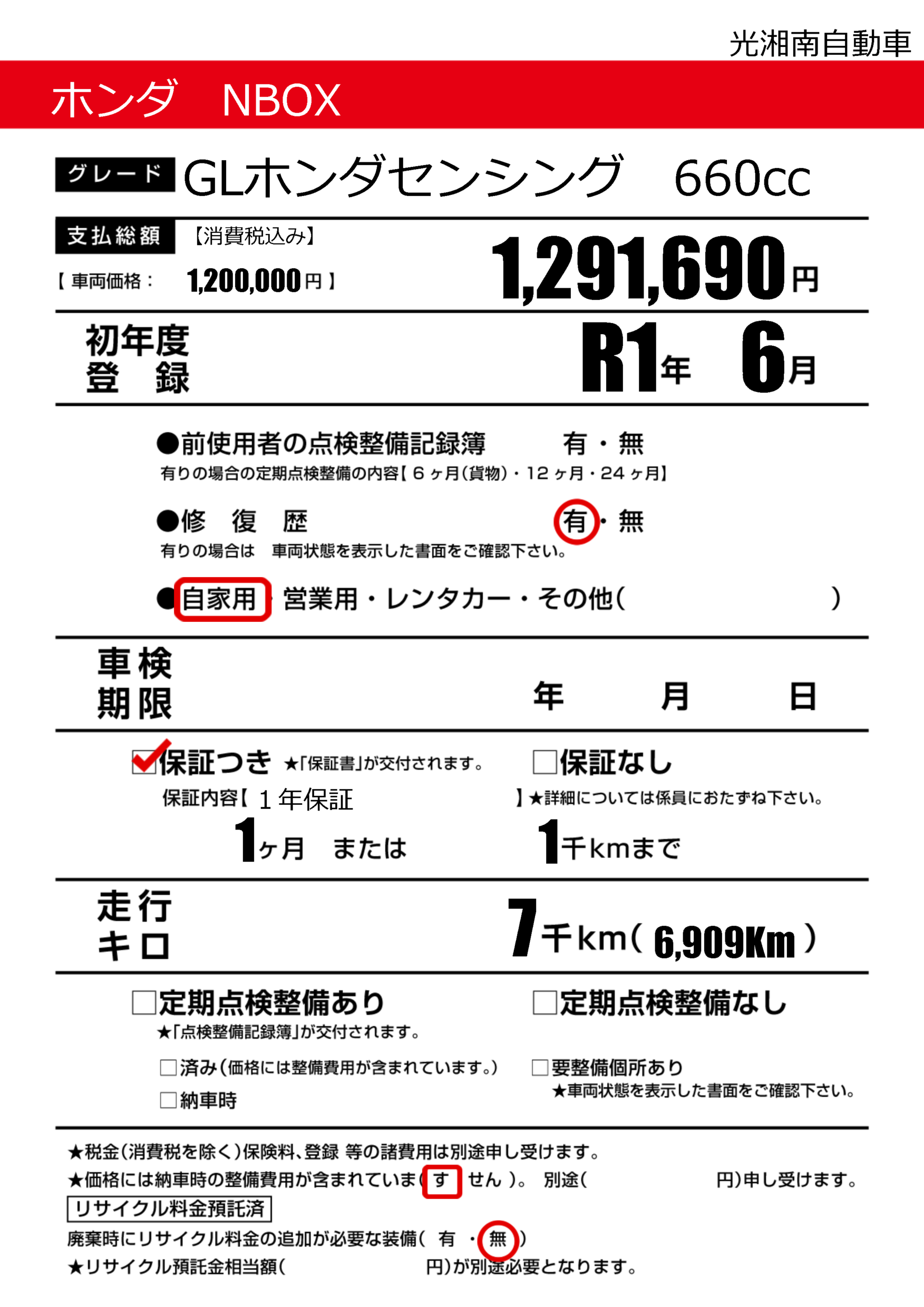 保証付き 保証内容(1年保証) 1ヶ月または(1)千kmまで |