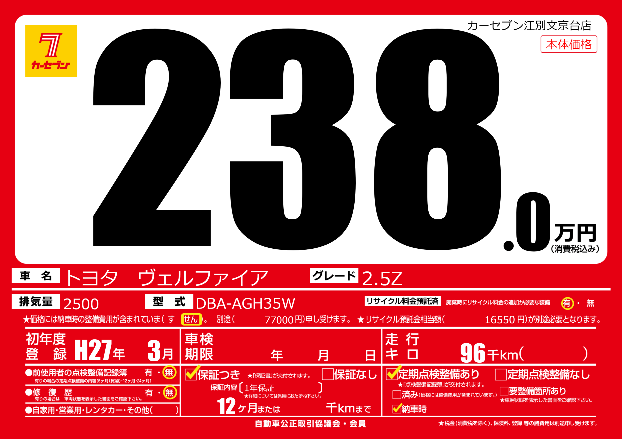 | 車名 | トヨタ ヴェルファイア | グレード ミッション 排気量 |