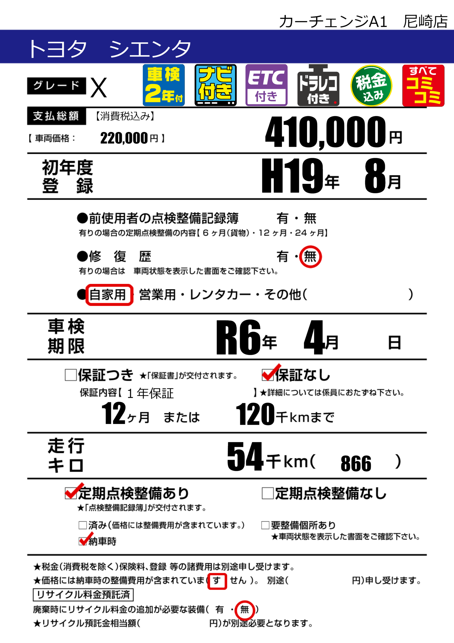 あり | 車検制限 | R6年4月---月 |