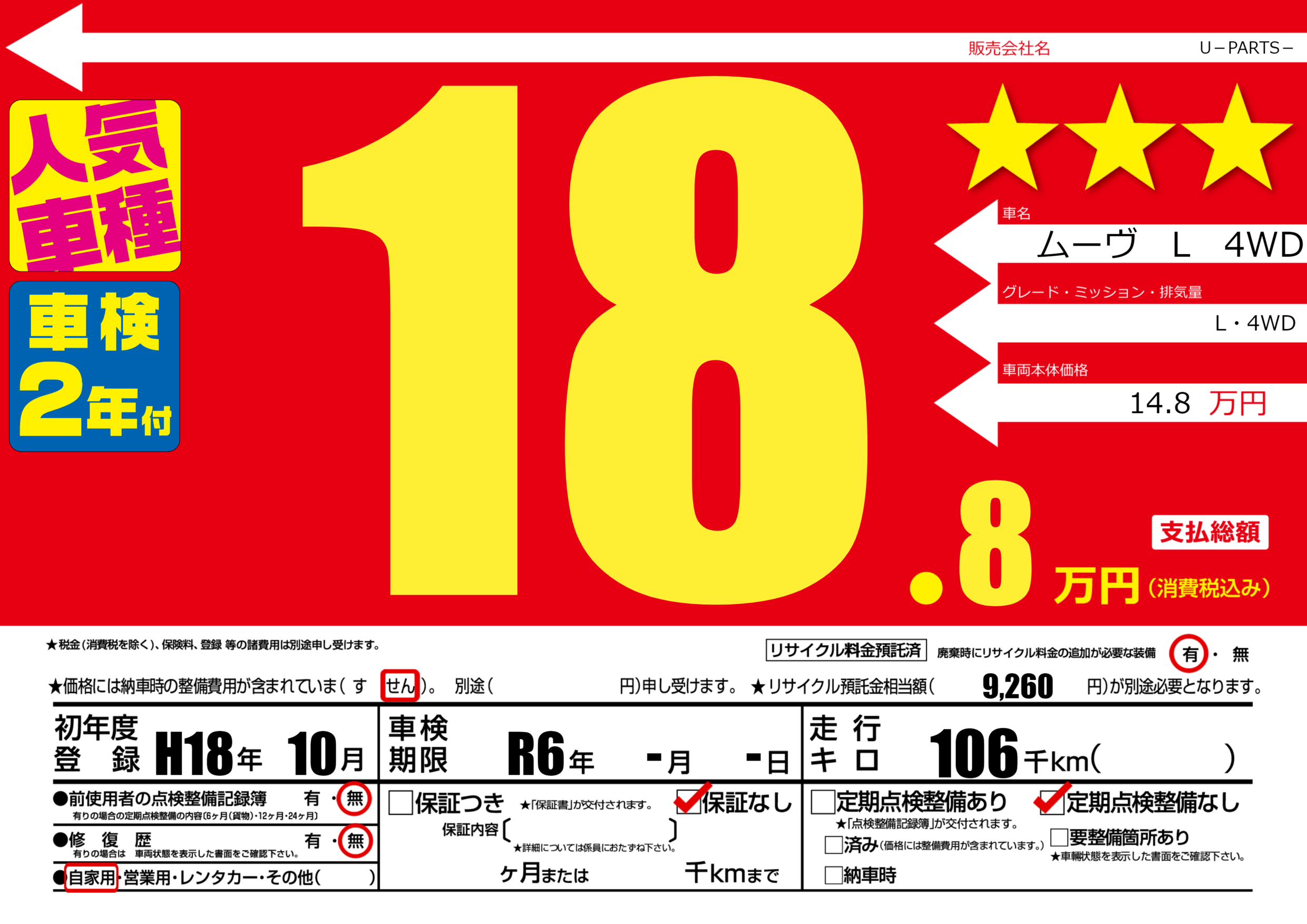 | 車名 | ムーヴ L 4WD | グレード ミッション 排気量 |