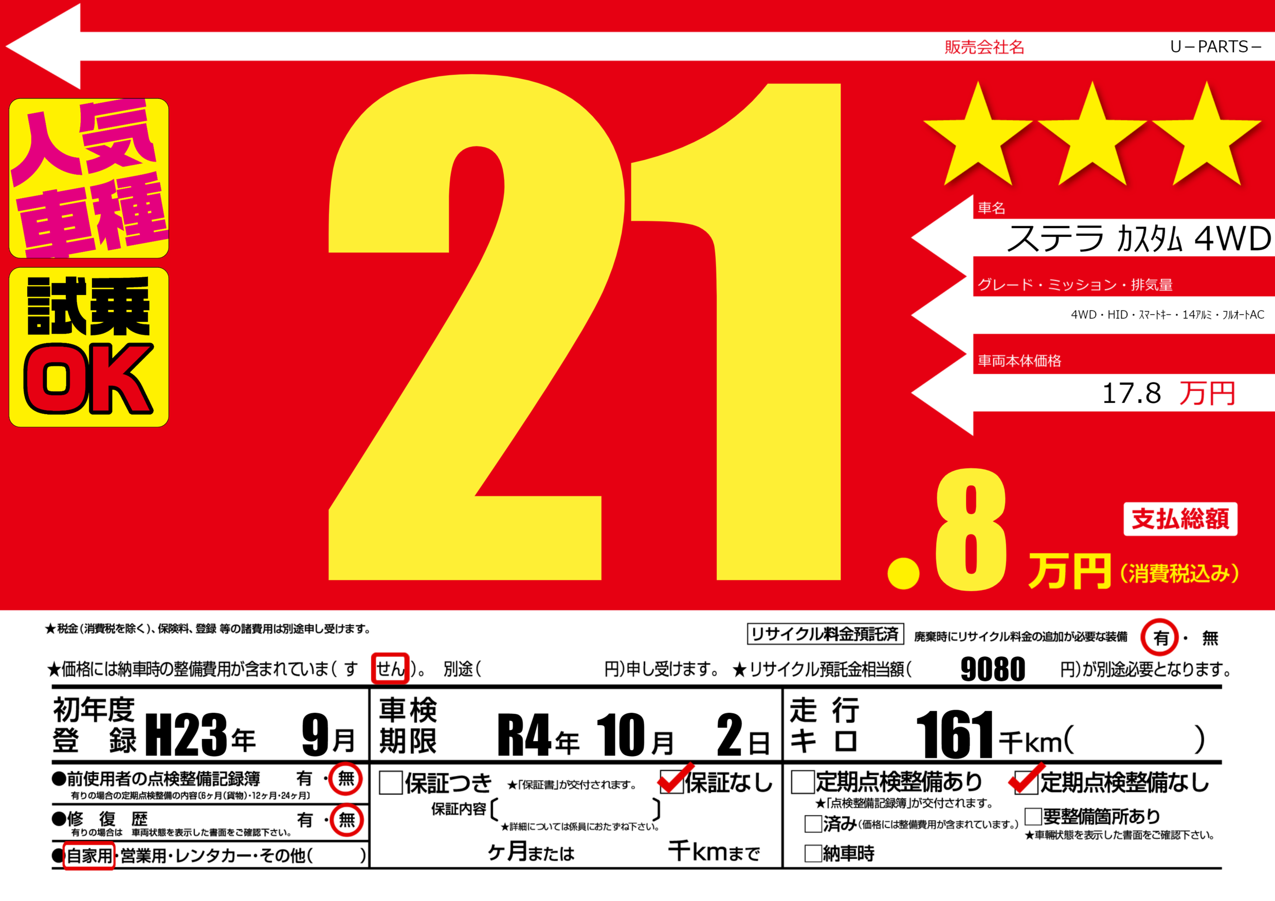 | 車名 | ステラ カスタム 4WD | グレード ミッション 排気量 |