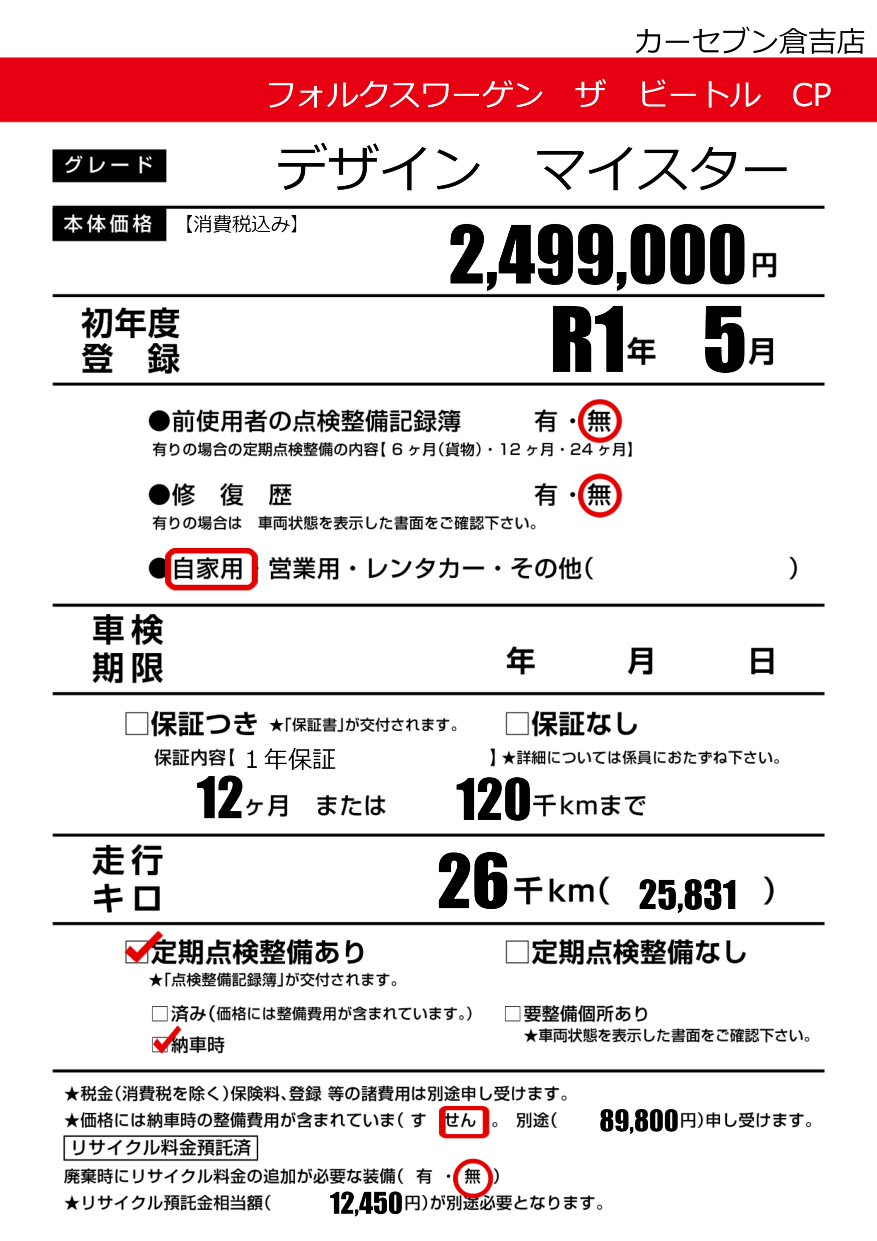| 定期点検整備 | 定期点検整備あり 納車時あり | ||